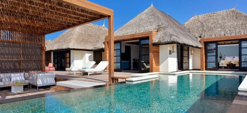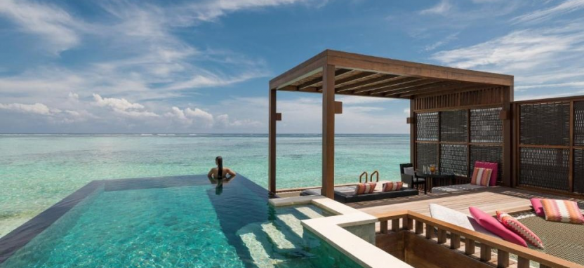 Sunrise Water Villa with Pool (70 кв. м, внешняя территория 113 кв. м) – водная вилла с видом на восход солнца. Спальня с кроватью king-size или 2 односпальные кровати, кушетка, зона отдыха, гардеробная, ванная комната с двойной раковиной, ванной и тропическим душем, меблированная терраса с бассейном, зоной отдыха, надводным гамаком, спуском в воду и видом на океан. Размещение – 3 взрослых с ребенком или 2 взрослых с 2 детьми.