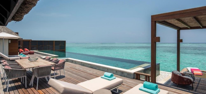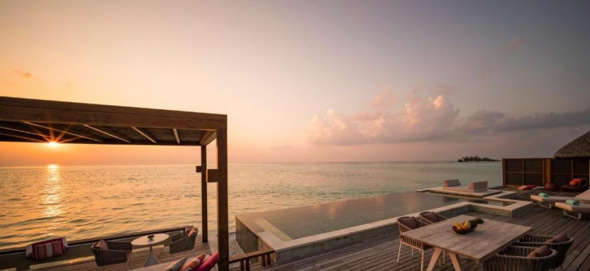 Sunset Water Villa with Pool (70 кв. м, внешняя территория 113 кв. м) – водная вилла с видом на закат. Спальня с кроватью king-size или 2 односпальные кровати, кушетка, зона отдыха, гардеробная, ванная комната с двойной раковиной, ванной и тропическим душем, меблированная терраса с бассейном, зоной отдыха, надводным гамаком, спуском в воду и видом на океан. Размещение – 3 взрослых с ребенком или 2 взрослых с 2 детьми.