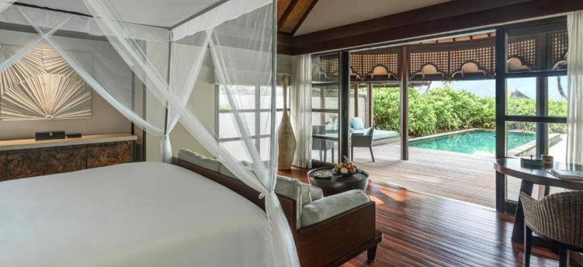 Garden Pavilion with Pool (56 кв. м) – пляжная вилла в саду. Кровать king-size или 2 односпальные кровати, раскладная кровать или детская кроватка, зона отдыха, ванная комната с двойной раковиной и ванной, тропический душ на свежем воздухе, меблированная терраса с бассейном, зоной отдыха, выходом к пляжу и видом на сад. Размещение – до 3 человек.