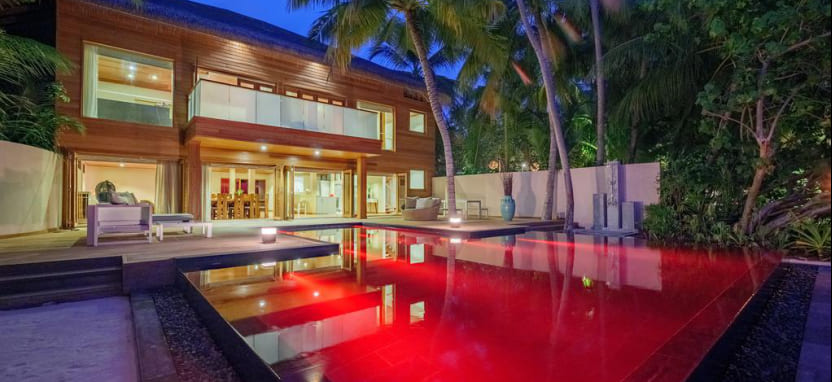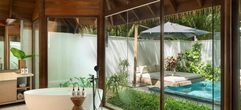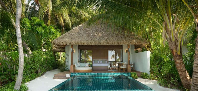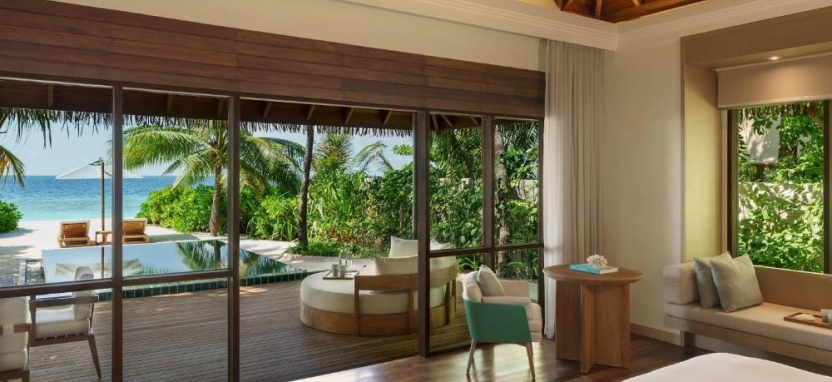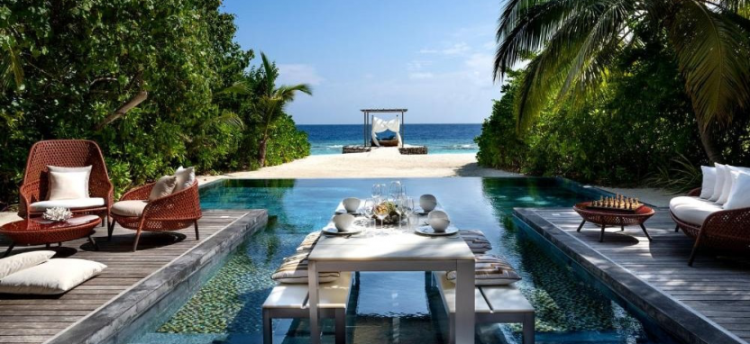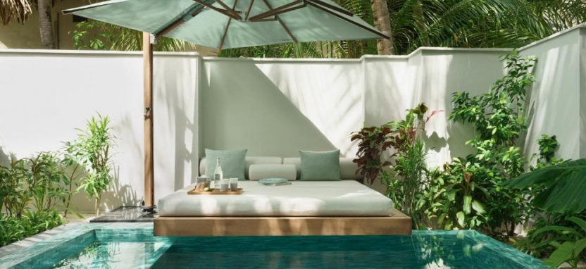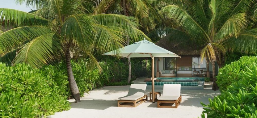 Three-Bedroom Beach Pavilion with Pool (800 кв. м) – двухуровневый пляжный павильон в саду с тремя спальнями и видом на закат. Спальня с кроватью king-size, 2 спальни с двумя односпальными кроватями, кушетка, просторная гостиная, столовая зона, 3 ванные комнаты с ванной и тропический душем, зона для спа-процедур на свежем воздухе, меблированная терраса с бассейном, зоной отдыха, выходом к пляжу и видом на океан. Размещение – до 9 человек.