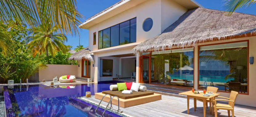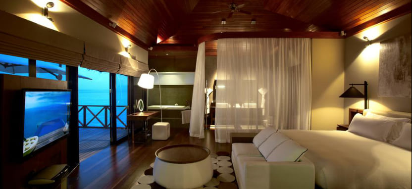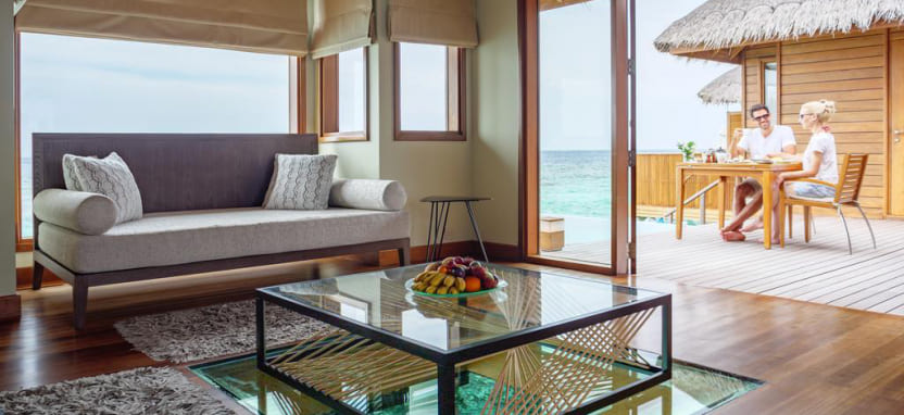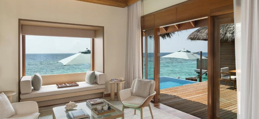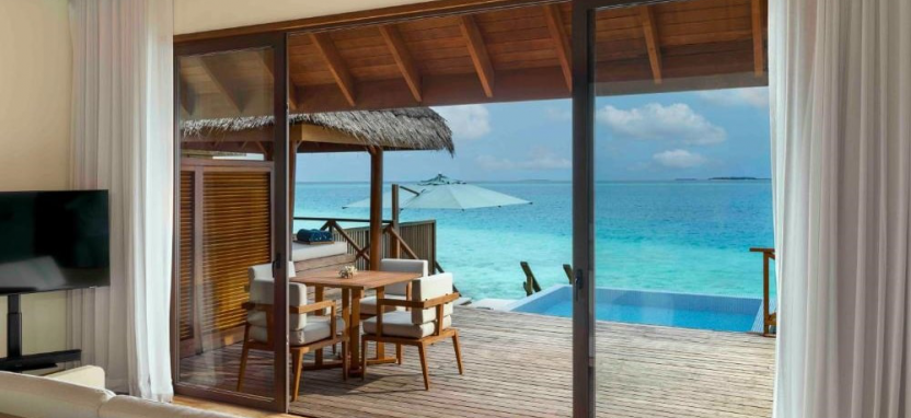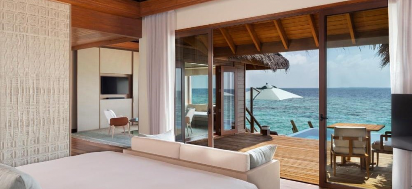 Two-Bedroom Ocean Pavilion with Pool (330 кв. м) – водный павильон с двумя спальнями и видом на закат. Спальня с кроватью king-size, спальня с двумя односпальными кроватями, кушетка, кухня, гостиная с обеденной зоной, 2 ванные комнаты с ванной и тропический душем, меблированная терраса с полузакрытым бассейном, зоной отдыха, обеденным зоной, спуском в воду и видом на океан. Размещение – до 6 человек.