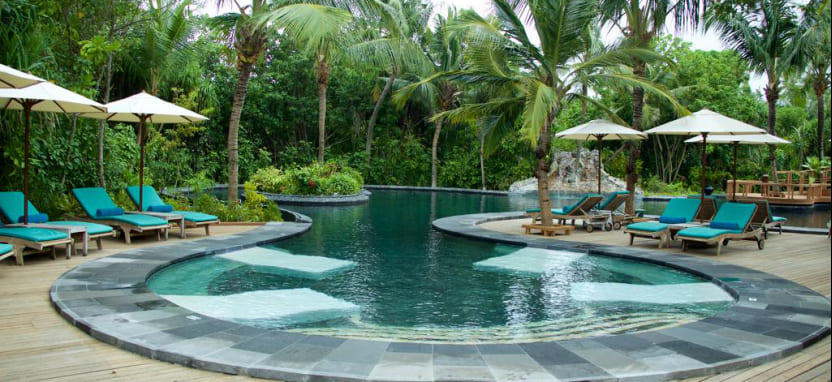 Deluxe Beach Villa with Family Private Pool (400 кв. м) – семейная пляжная вилла в саду. Спальня с кроватью super king-size, туалетный столик, гостиная, ванная комната открытого плана с двумя раковинами, круглой гидромассажной ванной и душем, тропический душ на свежем воздухе, частный бассейн в саду с шезлонгами и зоной отдыха, терраса с зоной отдыха, шезлонгами, беседкой с обеденной зоной, выходом к пляжу и видом на океан. Размещение – 2 взрослых с 3 детьми (2 ребенка до 12 лет и 1 ребенок до 2 лет).