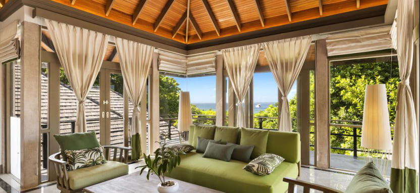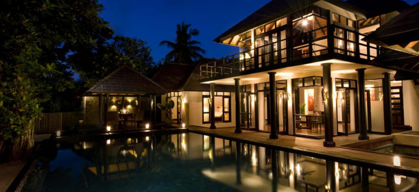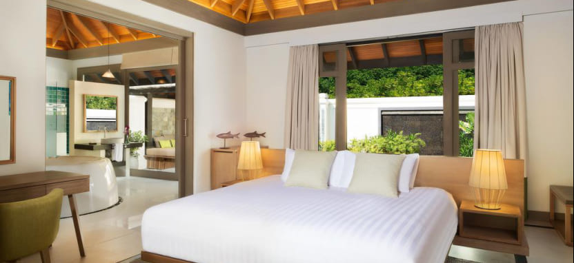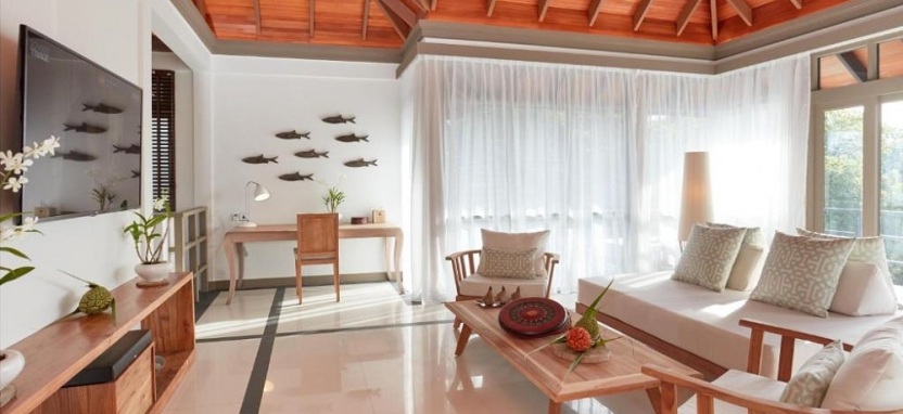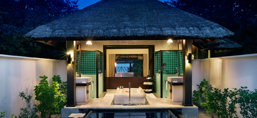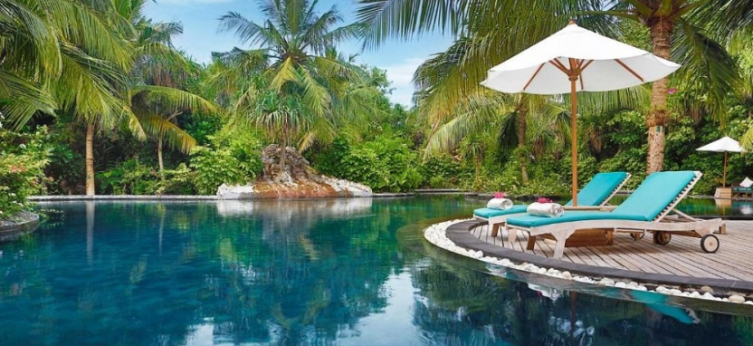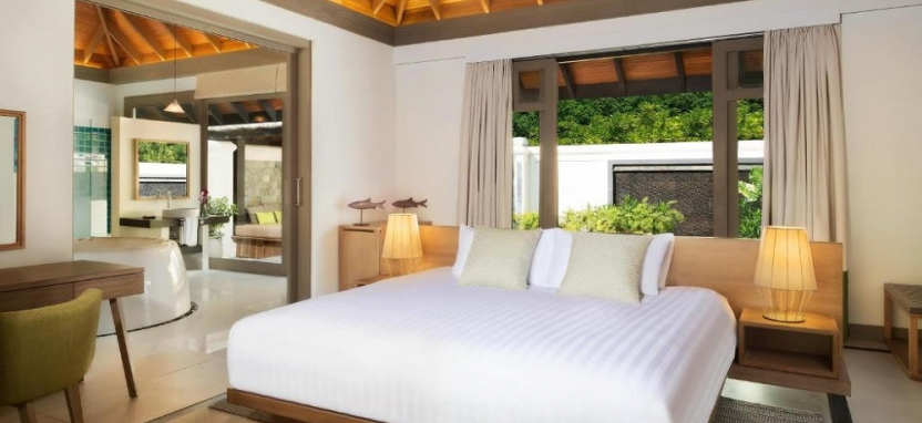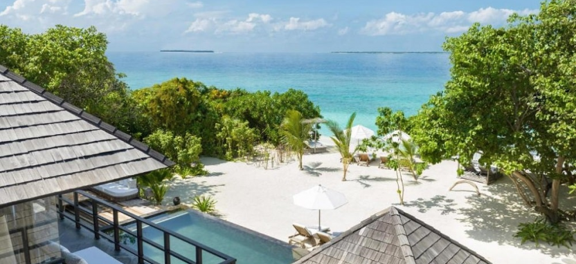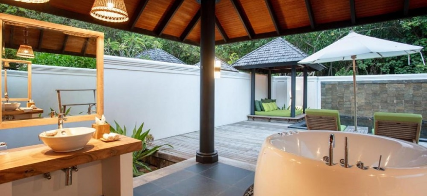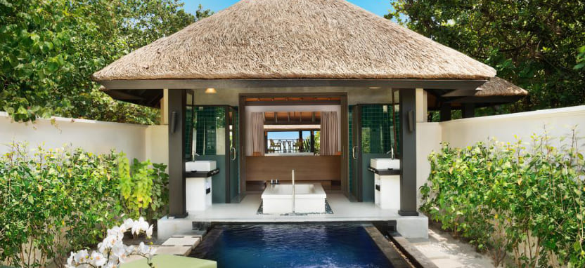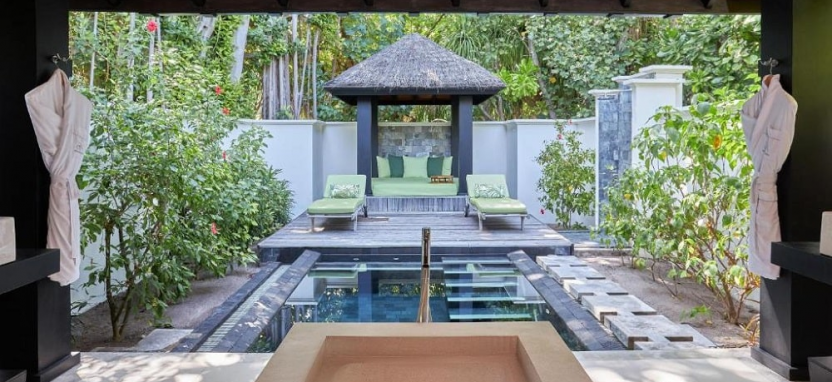 Beach Villa with Private Pool (200 кв. м) – пляжная вилла в саду. Кровать super king-size, диван, туалетный столик, ванная комната открытого плана с двумя раковинами, углубленной ванной и душем, тропический душ на свежем воздухе, частный бассейн в саду с шезлонгами и зоной отдыха, выход к пляжу, оборудованному шезлонгами и беседкой с обеденной зоной, вид на океан. Размещение – 2 взрослых с 2 детьми (1 ребенок до 12 лет и 1 ребенок до 2 лет).