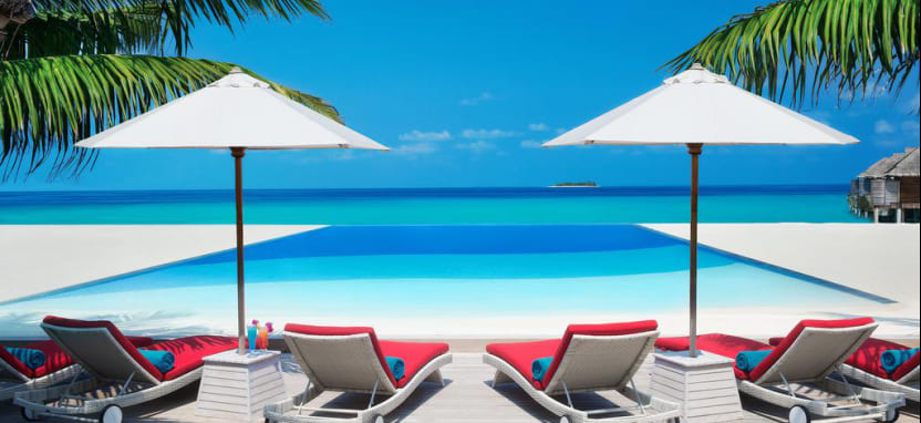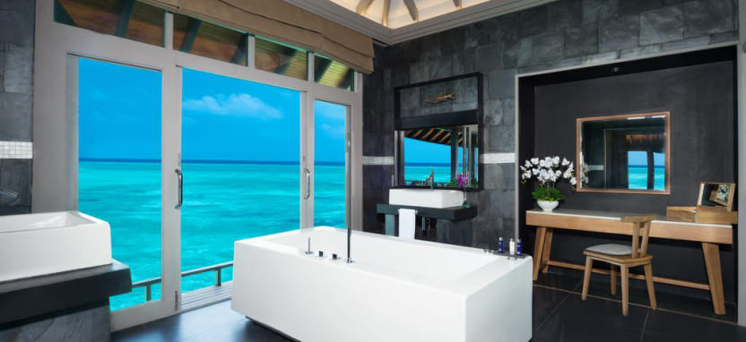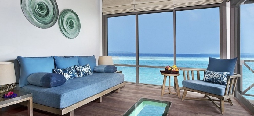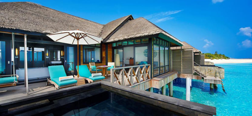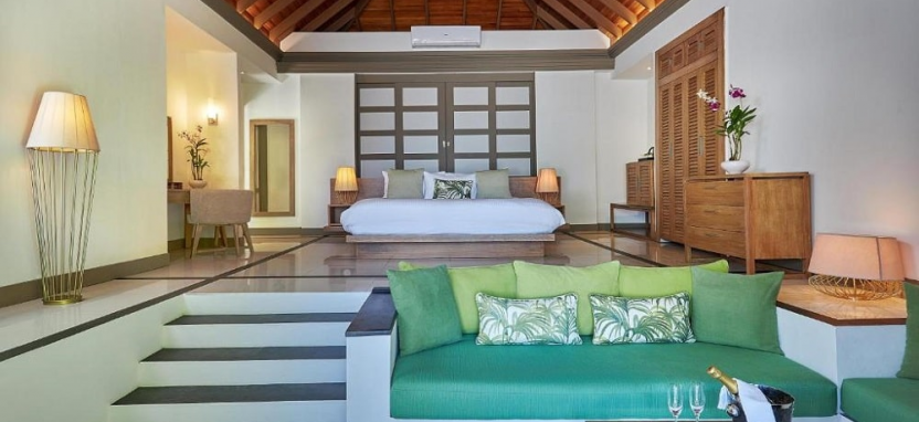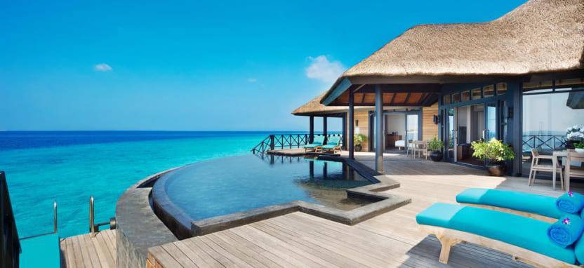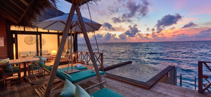 Sunrise Water Villa with Infinity Pool (135 кв. м) – водная вилла с видом на восход солнца. Кровать super king-size, гостиная зона со стеклянной вставкой в полу, ванная комната с двумя раковинами, гидромассажной ванной и тропическим душем, терраса с инфинити-бассейном, шезлонгами, подвесными качелями, обеденной зоной, спуском в воду и видом на океан. Размещение – 2 взрослых с 2 детьми (1 ребенок до 12 лет и 1 ребенок до 2 лет).