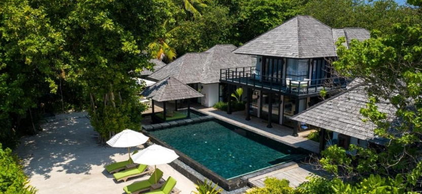 Three-Bedroom Island Residence with Family Pool & Private Pool (2022 кв. м) – двухуровневая пляжная резиденция с тремя спальнями, в каждой спальни кровать super king-size и диван. Просторная гостиная, комната для просмотра кино на втором этаже, балкон, 3 ванные комнаты открытого плана с двумя раковинами, круглой гидромассажной ванной и душем, одна из них оборудована частным бассейном, тропический душ на свежем воздухе, пространство для спа-процедур, парная и сауна, терраса с большим бассейном, многочисленными зонами отдыха, шезлонгами, обеденной зоной, выходом к пляжу и видом на частный сад. Размещение – 6 взрослых с 3 детьми до 12 лет и 2 детьми до 2 лет.