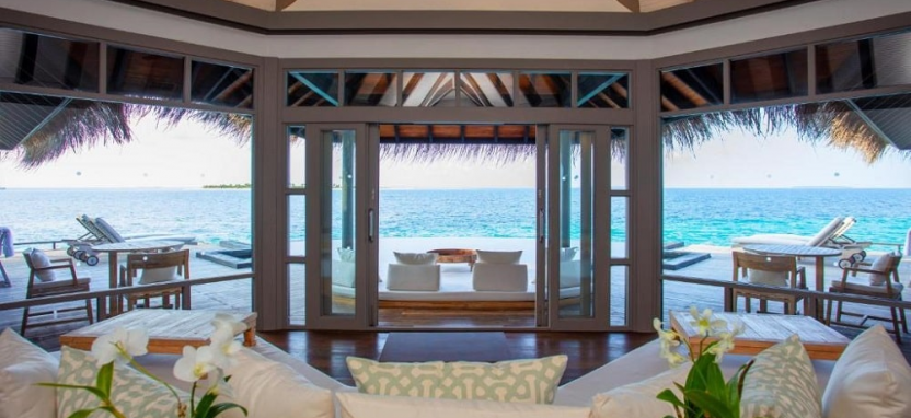 Two-Bedroom Ocean Residence with Family Infinity Pool (377 кв. м) – уединенная водная резиденция с двумя спальнями, в каждой кровать super king-size. Письменный стол и кушетка, гостиная с панорамными окнами, 2 ванные комнаты с двумя раковинами, гидромассажной ванной и тропическим душем, терраса с инфинити-бассейном, шезлонгами, зоной отдыха, обеденной зоной, спуском в воду и видом на океан, расположена в самом конце пристани. Размещение – 4 взрослых с 2 детьми до 12 лет и 2 детьми до 2 лет.