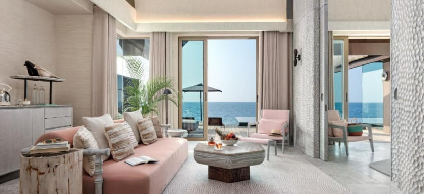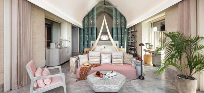 Three-Bedroom Ocean Residence with Two Pools (400 кв. м) – просторная водная резиденция. Три спальни с кроватями king-size и балконами, 2 гостиные, кухня с обеденной зоной, отдельная СПА-комната, ванная комната в стиле СПА, терраса с 2 бассейнами, зоной отдыха, тропическим душем, спуском в воду и видом на океан. Размещение – 7 взрослых или 6 взрослых с 2 детьми.