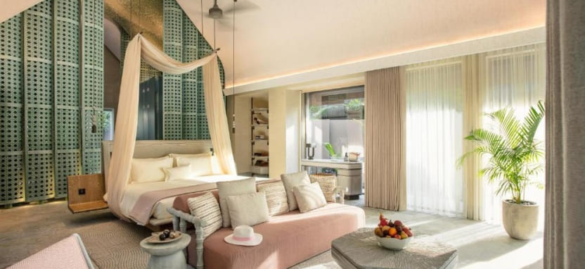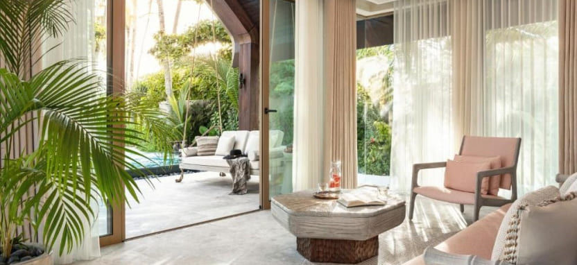 Beach Villa with Pool (108 кв. м) – пляжная вилла в тропическом саду. Спальня с кроватью king-size, гостиная зона, ванная комната в стиле СПА с ванной на открытом воздухе, терраса с бассейном, зоной отдыха, тропическим душем, выходом к пляжу и видом на океан. Размещение – 3 взрослых или 2 взрослых с ребенком.