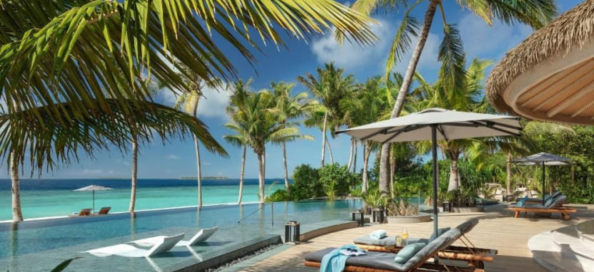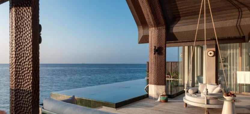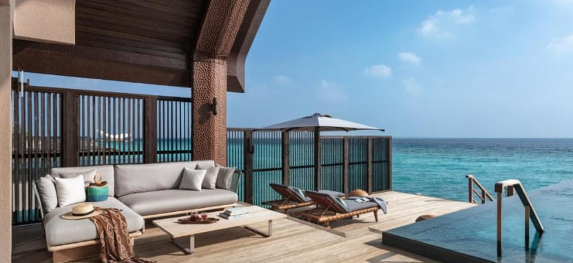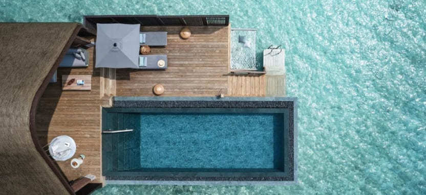 Water Villa with Pool (100 кв. м) – водная вилла. Спальня с кроватью king-size, гостиная зона, ванная комната в стиле СПА, терраса с бассейном, зоной отдыха, тропическим душем, спуском в воду и видом на океан. Размещение – 3 взрослых или 2 взрослых с ребенком.