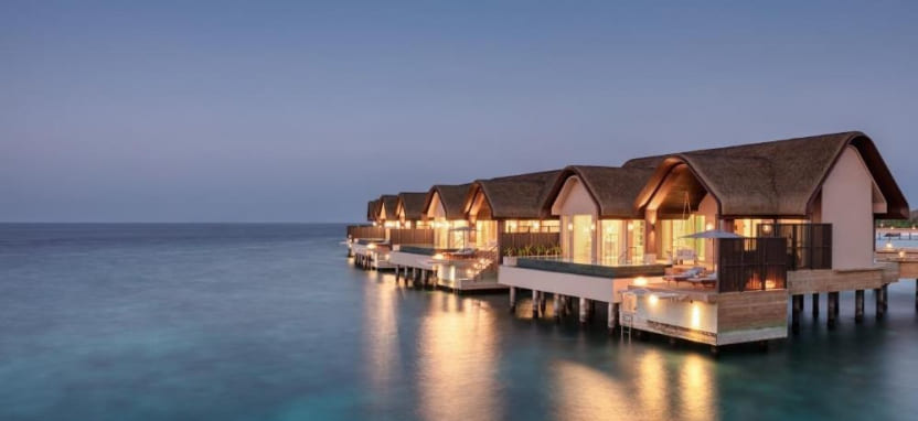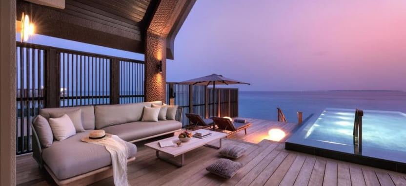 Luxury Sunset Water Villa with Pool (108 кв. м) – водная вилла с видом на закат. Спальня с кроватью king-size, гостиная зона, ванная комната в стиле СПА, терраса с бассейном 35 кв. м, зоной отдыха, тропическим душем, спуском в воду и видом на океан. Размещение – 3 взрослых или 2 взрослых с 2 детьми.