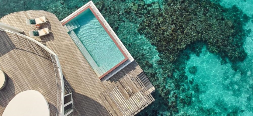 Water Villa with Pool (351 кв. м) – водная вилла. Спальня с кроватью king-size, отдельная гостиная, ванная комната с ванной и тропическим душем на открытом воздухе, меблированная терраса с бассейном, спуском в воду и видом на океан, отдельная терраса на крыше с зоной отдыха. Размещение – 3 взрослых или 2 взрослых с 2 детьми.