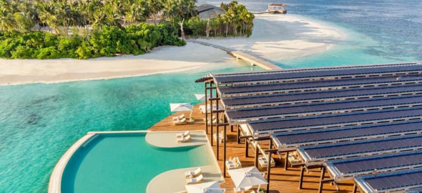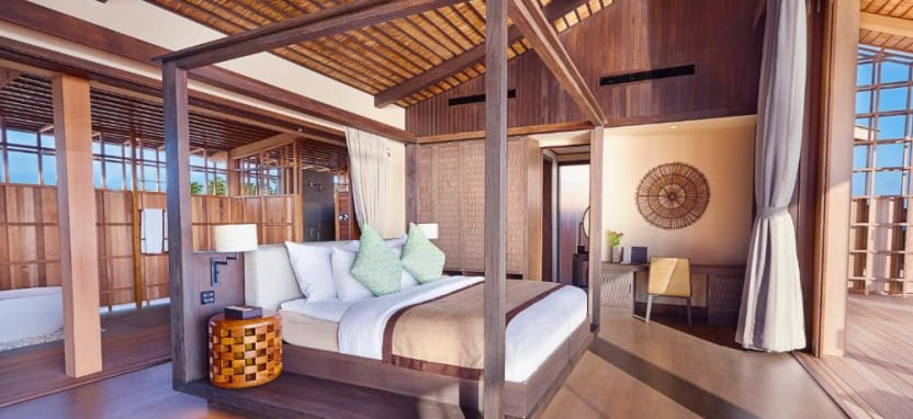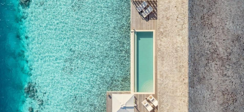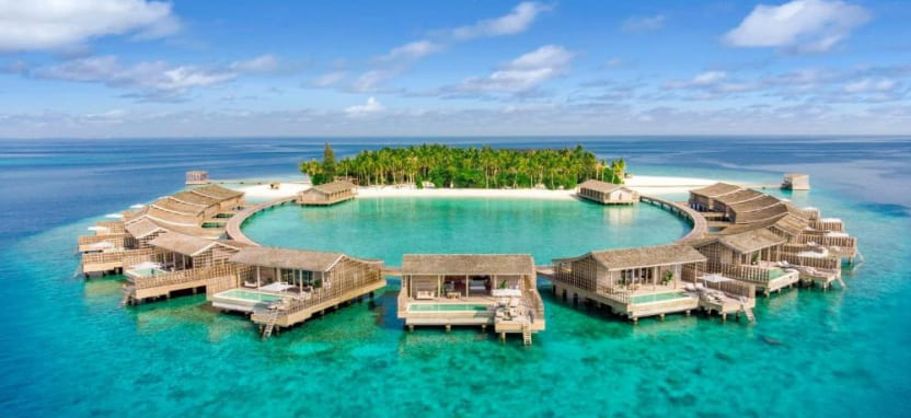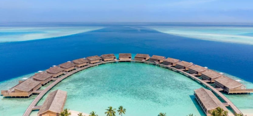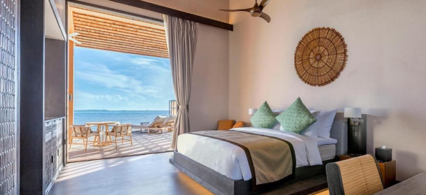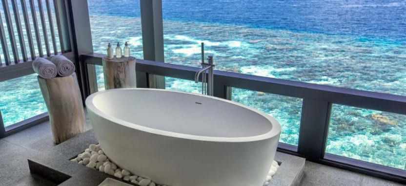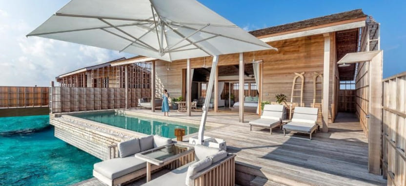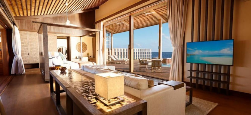 One Bedroom Ocean Residence (310 кв. м) – водное бунгало со спальней с кроватью king-size. Гостиная, гардеробная, ванная комната с гидромассажной ванной и душем, большая терраса с бассейном, душем на открытом воздухе, зонами отдыха, обеденной зоной, спуском в воду и видом на океан.