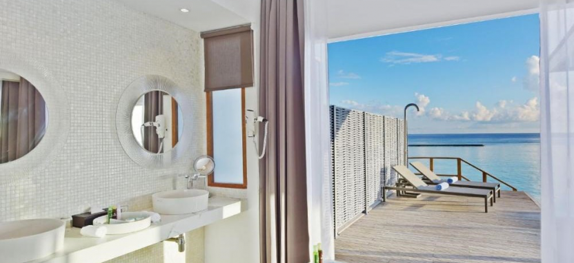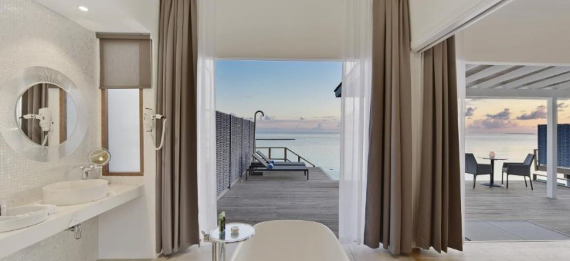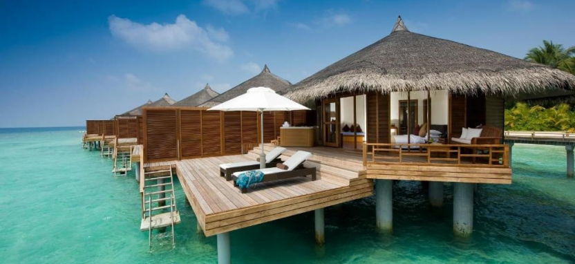 Water Villa (90 кв. м) – водная вилла. Кровать king-size, зона отдыха, гардеробная, полуоткрытая ванная комната с душем и туалетным столиком, терраса с джакузи, шезлонгами, зоной отдыха, спуском в воду и видом на океан. Размещение – 3 взрослых или 2 взрослых с ребенком.