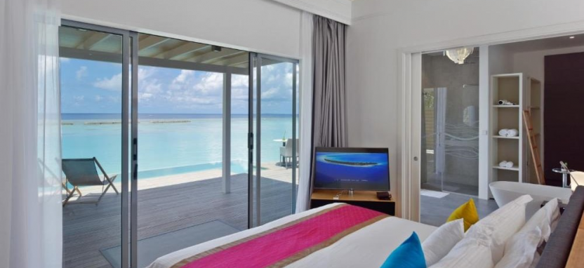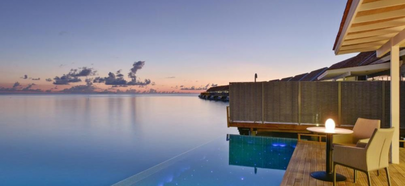 Thundi Water Villa with Pool (142 кв. м) – водная вилла на краю песчаной отмели. Кровать king-size, кушетка, холодильник для вина, утюг и гладильная доска, ванная комната с ванной и душем, терраса с бассейном 18 кв. м, шезлонгами, лежаками, обеденной зоной, спуском в воду и видом на океан. Размещение – 3 взрослых или 2 взрослых с ребенком.