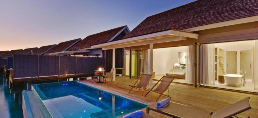 Water Villa with Pool (142 кв. м) – просторная водная вилла. Кровать king-size, кушетка, холодильник для вина, утюг и гладильная доска, ванная комната с ванной и душем, терраса с бассейном 18 кв. м, шезлонгами, лежаками, зоной отдыха, спуском в воду и видом на океан. Размещение – 3 взрослых или 2 взрослых с ребенком.