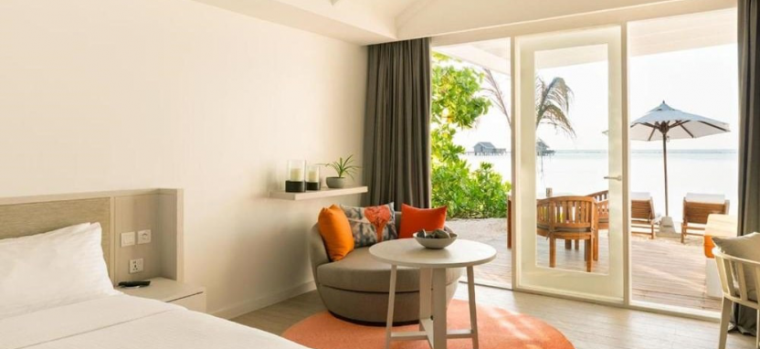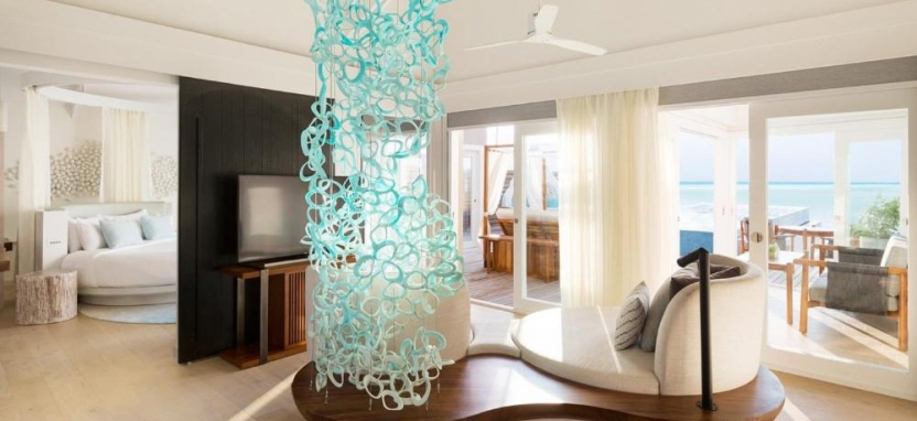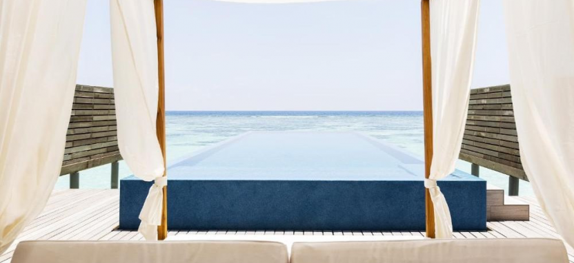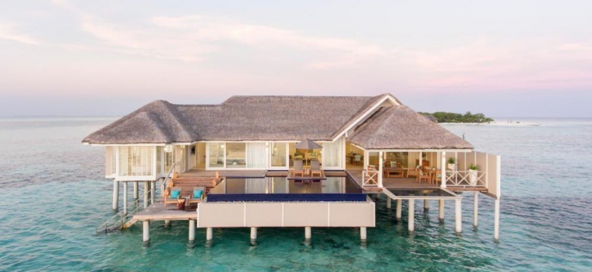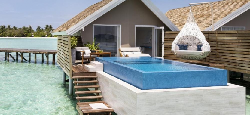 Water Villa (98 кв. м) – водная вилла с видом на закат. Кровать king-size, зона отдыха, стеклянная панель в полу, ванная комната с ванной и тропическим душем, меблированная терраса с бассейном, зоной отдыха, надводным гамаком, спуском в воду и видом на океан. Размещение – 3 взрослых или 2 взрослых с 2 детьми.