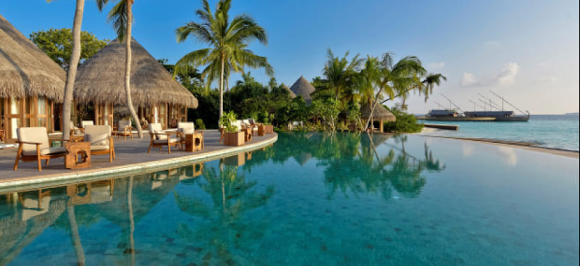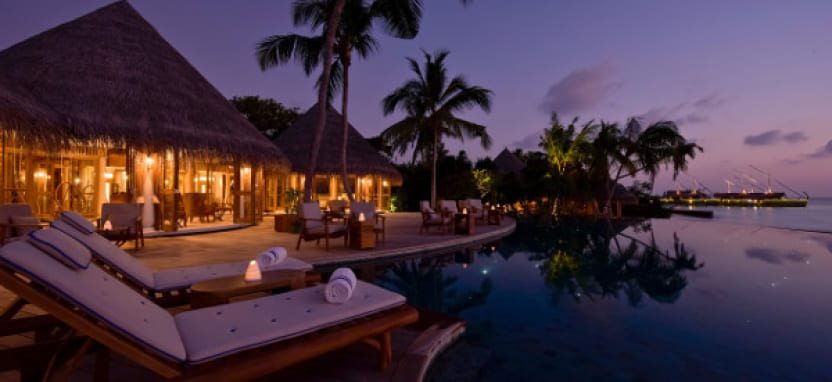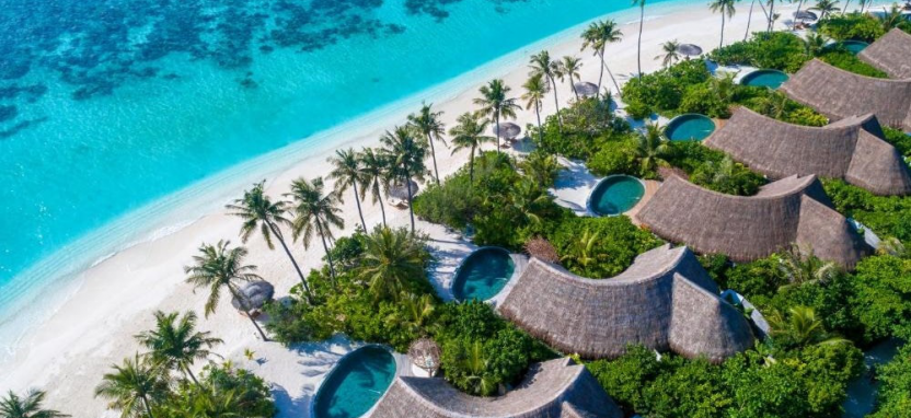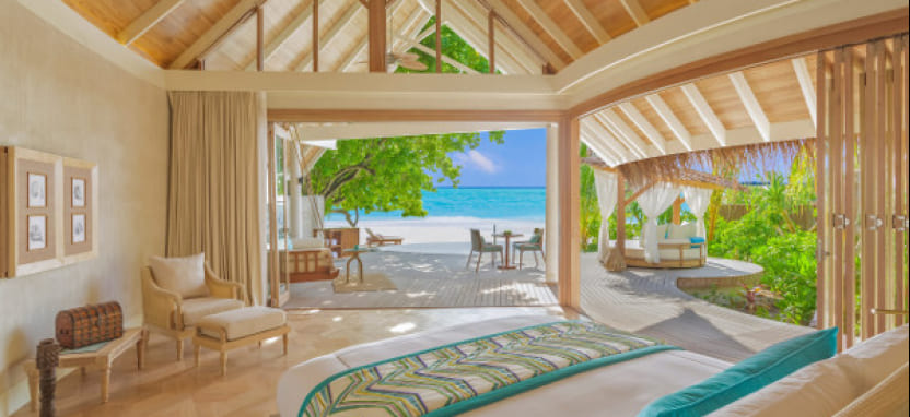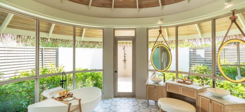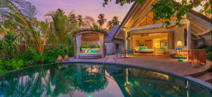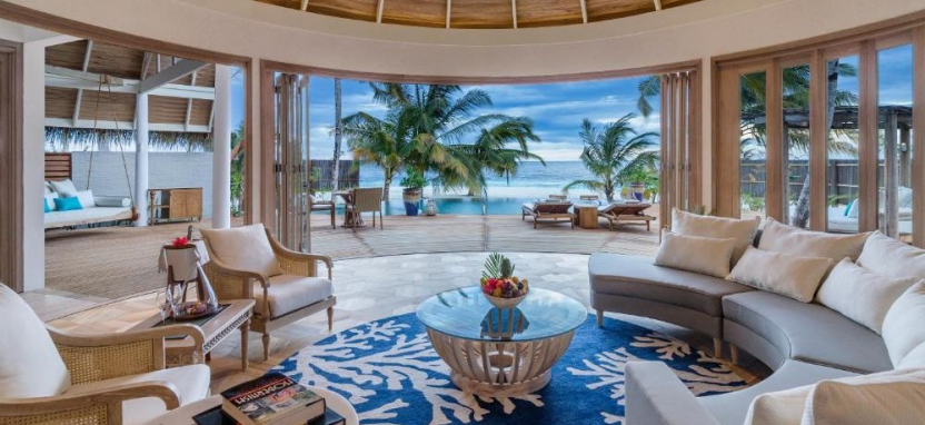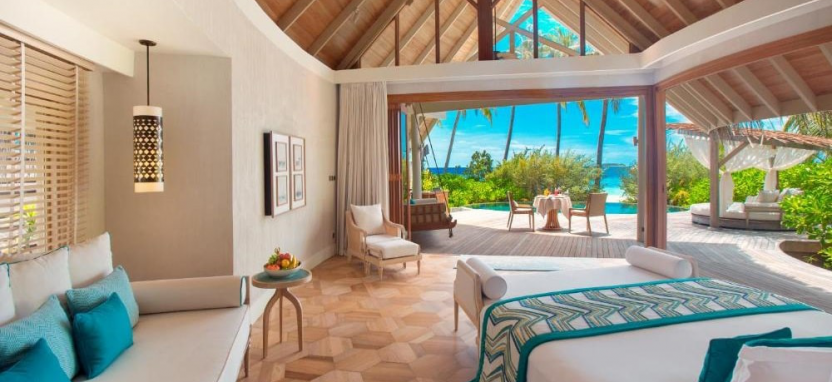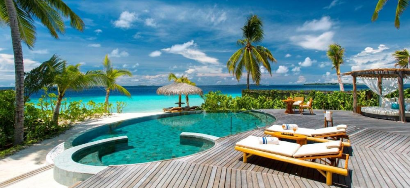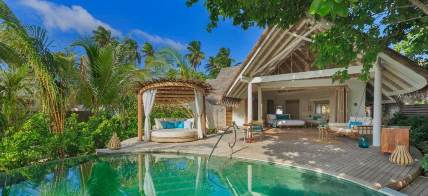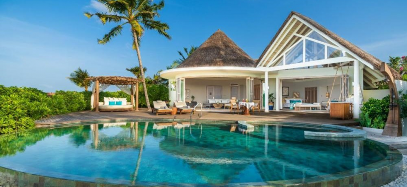 Beach Residence with Private Pool (490 кв. м) – пляжная резиденция в саду. Спальня с кроватью king-size, отдельная гостиная, кладовая, ванная комната с ванной и душем, тропический душ на свежем воздухе, меблированная терраса с соломенной крышей с инфинити-бассейном 60 кв. м, диваном-качалкой, обеденным столом, выходом к пляжу и видом на океан. Для гостей виллы доступны следующие привилегии: персональный дворецкий, личный шеф-повар, неограниченные услуги прачечной, разовое посещение кинотеатра под открытым небом, разовая трехчасовая прогулка на роскошном катере, один частный ужин на пляже. Размещение – до 3 человек.