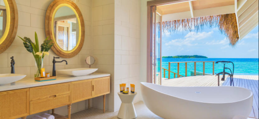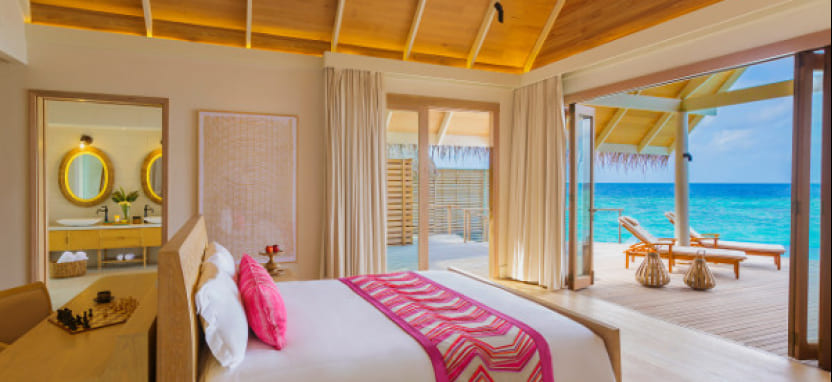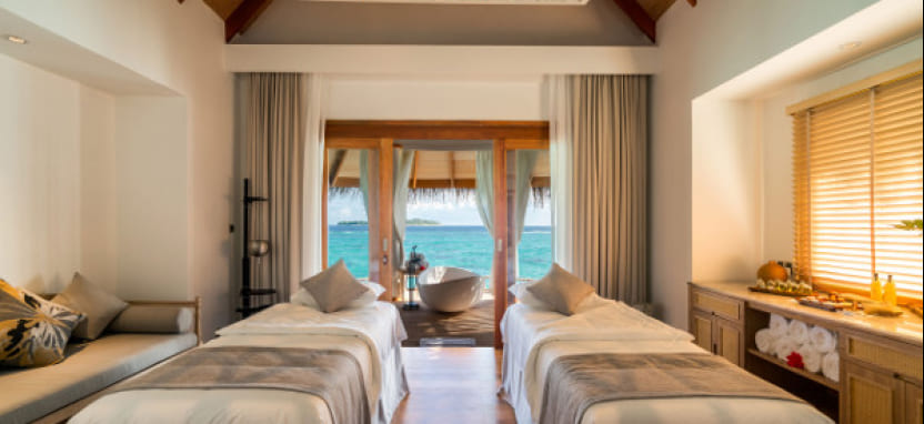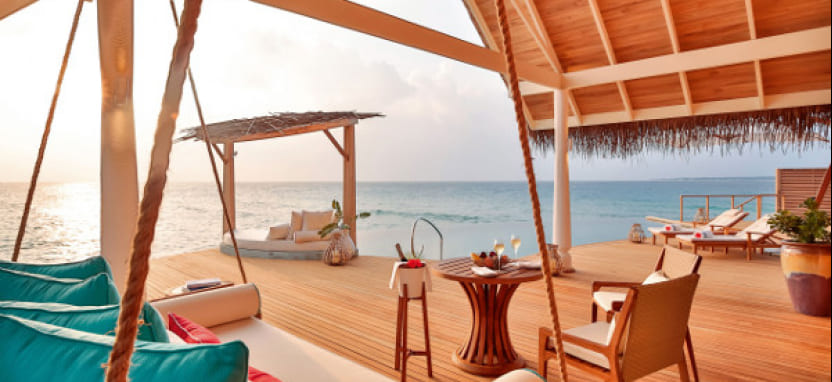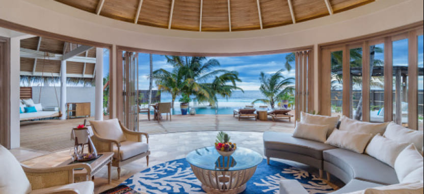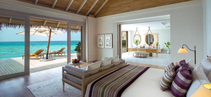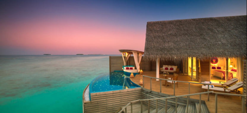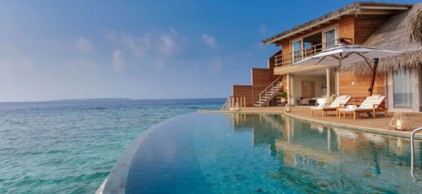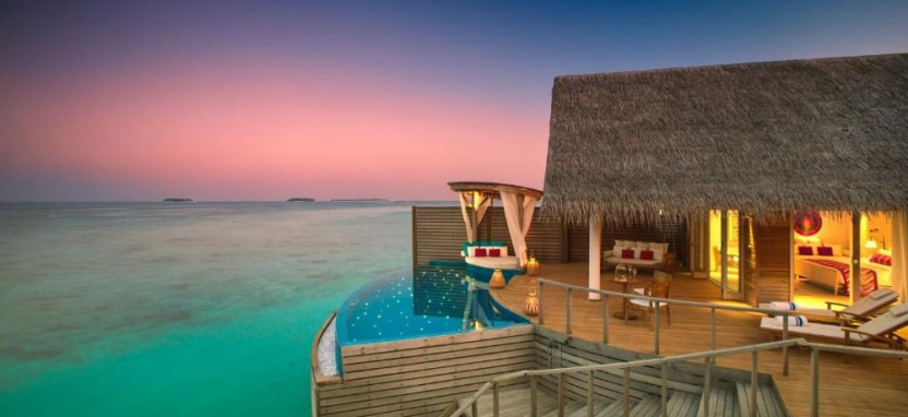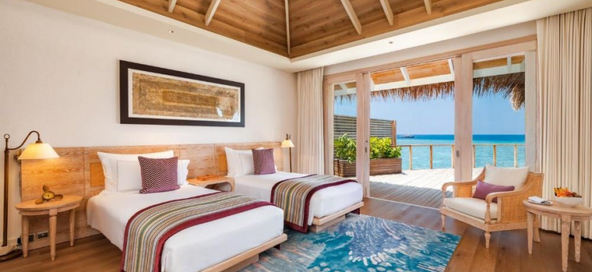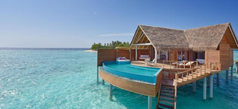 Two-Bedroom Ocean Residence with Private Pool (564 кв. м) – двухуровневая водная резиденция с двумя спальнями. Спальня с кроватью king-size, спальня с двумя односпальными кроватями, отдельная гостиная, кладовая, 2 ванные комнаты с ванной и тропическим душем, тренажерный зал, меблированная терраса с соломенной крышей с инфинити-бассейном 60 кв. м, диваном-качалкой, обеденным столом, спуском в воду и видом на океан. Для гостей виллы доступны следующие привилегии: персональный дворецкий, личный шеф-повар, неограниченные услуги прачечной, разовое посещение кинотеатра под открытым небом, разовая трехчасовая прогулка на роскошном катере, один частный ужин на пляже. Размещение – до 6 человек.