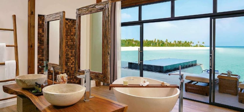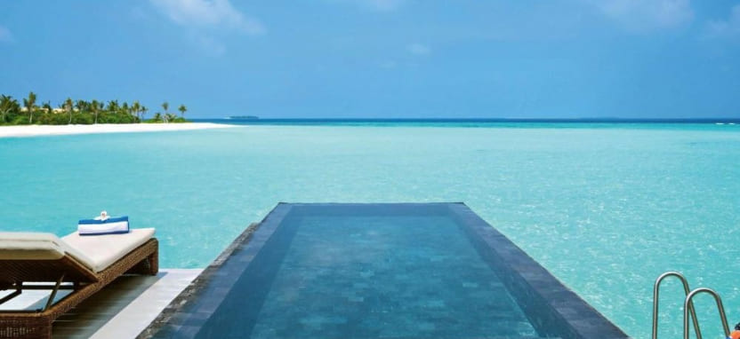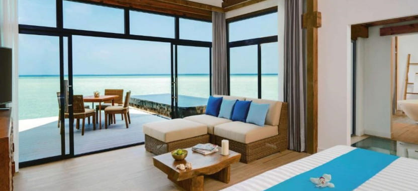 Overwater Pool Villa Ocean (140 кв. м) – водная вилла. Спальня с кроватью king-size или двумя односпальными кроватями, гардеробная, зона отдыха, обеденная зона, винный погреб, ванная комната с ванной и душем на открытом воздухе, меблированная терраса с бассейном, спуском в воду и видом на океан. Размещение – 2 взрослых с ребенком до 2-х лет.