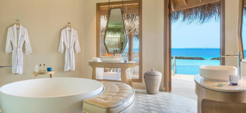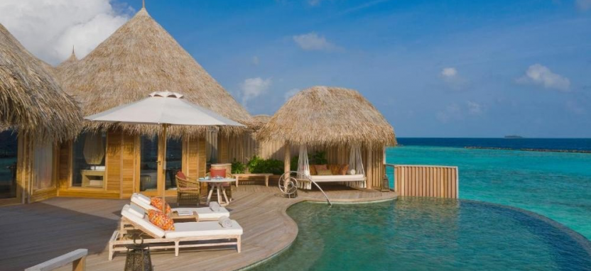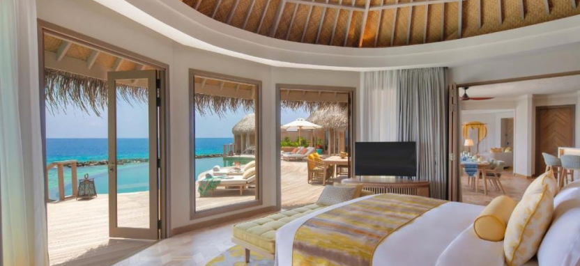 Ocean House with Private Pool (282 кв. м) – водная вилла. Спальня с кроватью king-size, отдельная гостиная с прозрачной вставкой в полу, ванная комната с ванной и тропическим душем, меблированная терраса с бассейном, зоной отдыха, спуском в воду и видом на океан. Всего 8 домов данной категории.