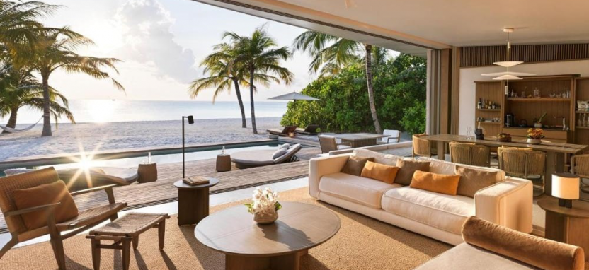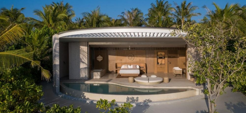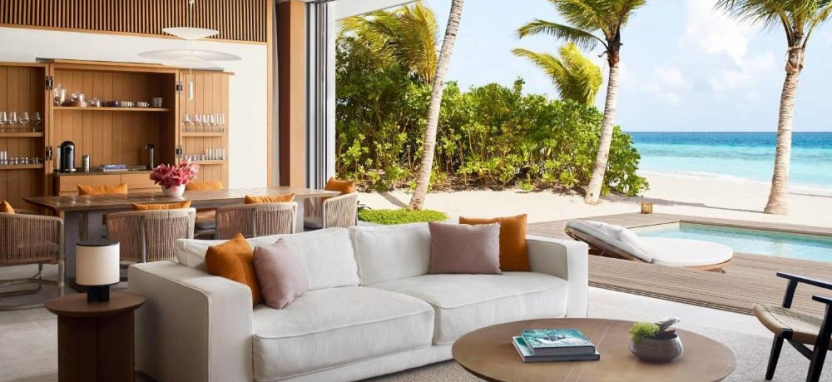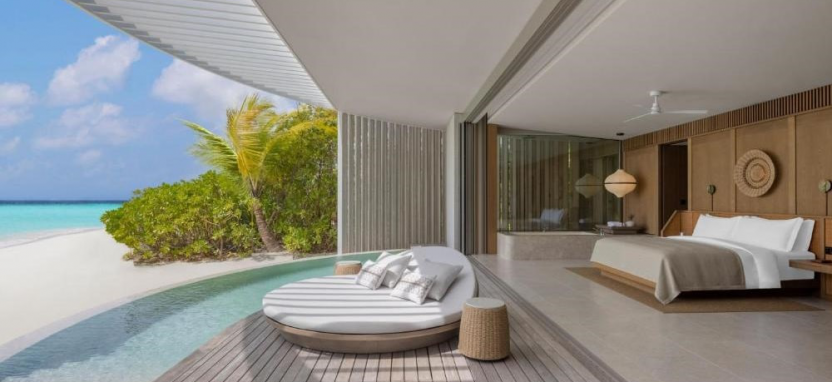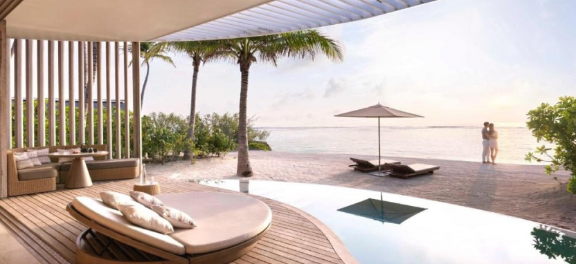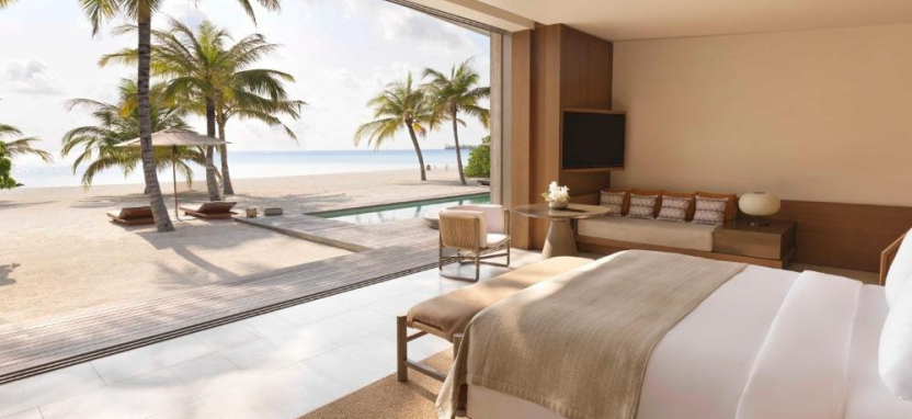 Beach Pool Villa (400 кв. м) – пляжная вилла с двумя спальнями. Спальня с кроватью king-size, спальня с двумя одноместными кроватями, отдельная гостиная, обеденная зона, гидромассажная ванна, 2 мраморные ванные комнаты с душем, меблированная терраса с инфинити-бассейном, выходом к пляжу и видом на океан. Размещение – до 6 человек.