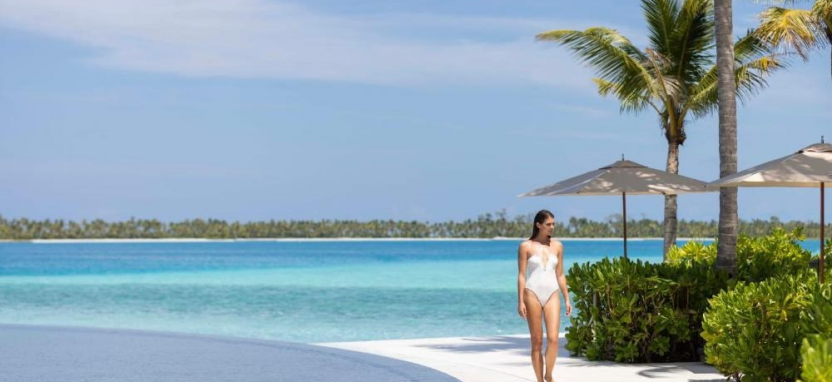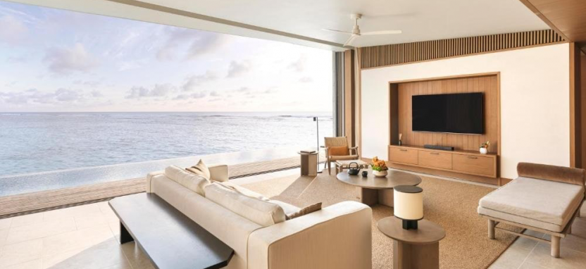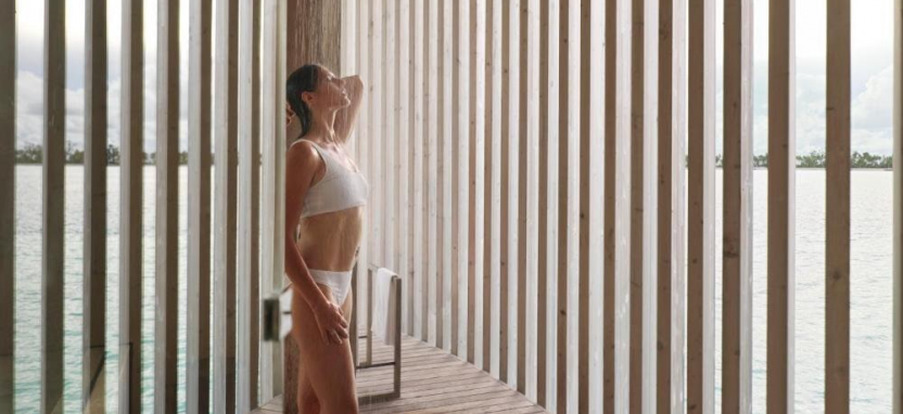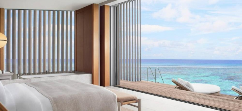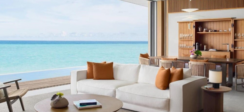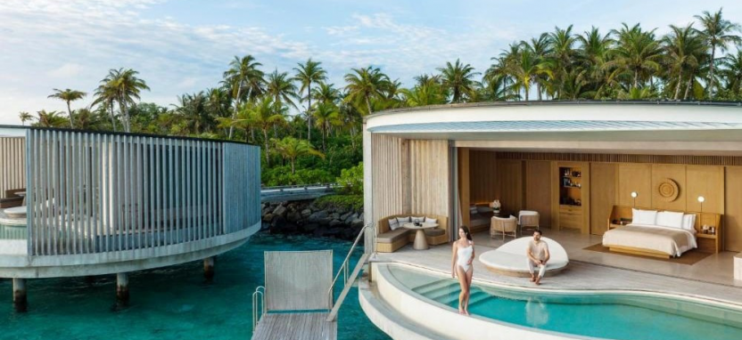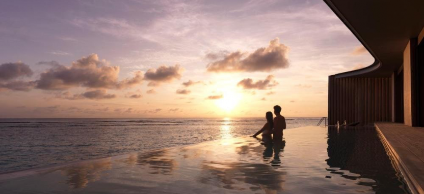 Ocean Pool Villa (150 кв. м) – водная вилла. Кровать king-size, зона отдыха, гидромассажная ванна, мраморная ванная комната с душем, меблированная терраса с инфинити-бассейном, спуском в воду и видом на океан. Размещение – до 3 человек.