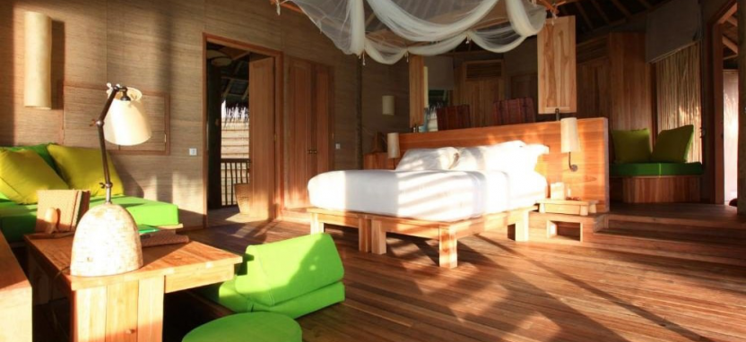 Ocean Water Villa (108 кв. м) – водная вилла. Кровать king-size, зона отдыха, ванная комната открытого плана со стеклянной ванной и тропическим душем на свежем воздухе, палуба на крыше, меблированная терраса с зоной отдыха, обеденной зоной со стеклянным столом, надводным гамаком, спуском в воду и видом на океан. Размещение – до 4 человек.