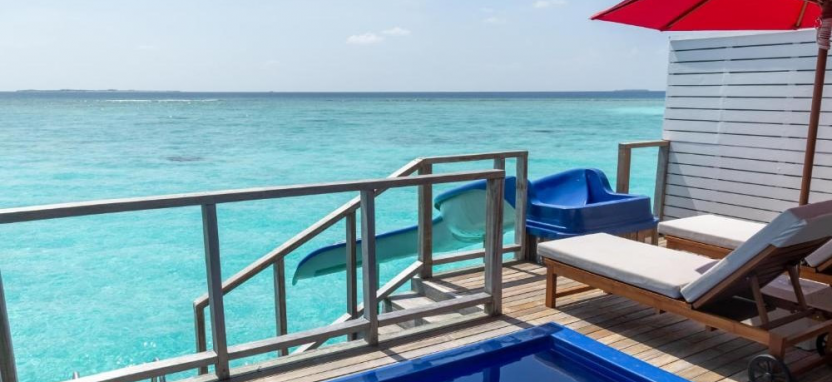 Water Villa with Pool & Slide (81 кв. м) – водная вилла. Кровать king-size, раскладной диван, письменный стол, ванная комната с душем, терраса с бассейном, водной горкой, шезлонгами, зоной отдыха, спуском в воду и видом на океан. Размещение – 3 взрослых или 2 взрослых с ребенком.