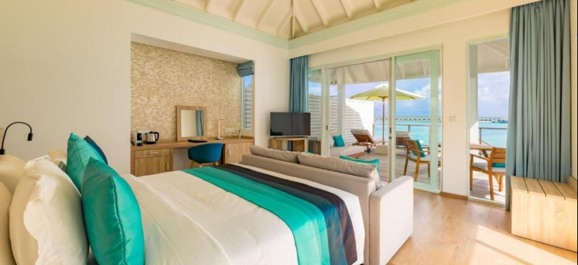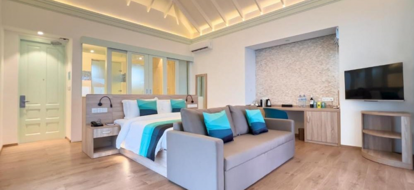 Lagoon Villa with Pool & Slide (97 кв. м) – водная вилла. Кровать king-size, раскладной диван, письменный стол, ванная комната ванной и душем, терраса с бассейном, водной горкой, шезлонгами, зоной отдыха, спуском в воду и видом на океан. Размещение – 3 взрослых или 2 взрослых с 2 детьми.