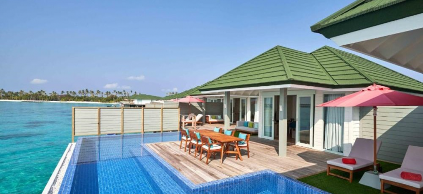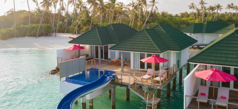 Two-Bedroom Lagoon Villa with Pool & Slide (170 кв. м) – семейная водная вилла. 2 спальни с кроватями king-size и раскладными диванами, отдельная гостиная, письменный стол, 2 ванные комнаты с душем под открытым небом, терраса с бассейном, водной горкой, шезлонгами, зоной отдыха, обеденной зоной, спуском в воду и видом на океан. Размещение – 6 взрослых или 4 взрослых с 2 детьми.