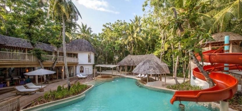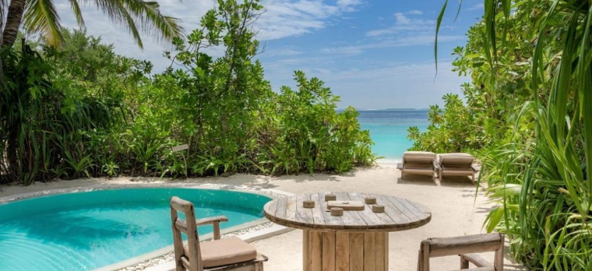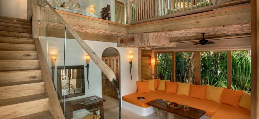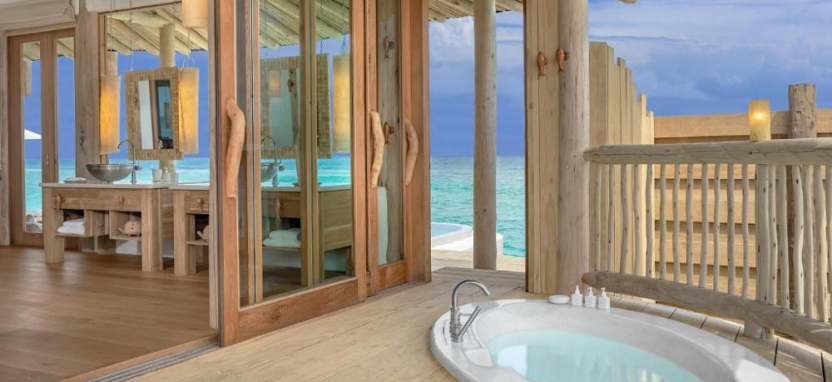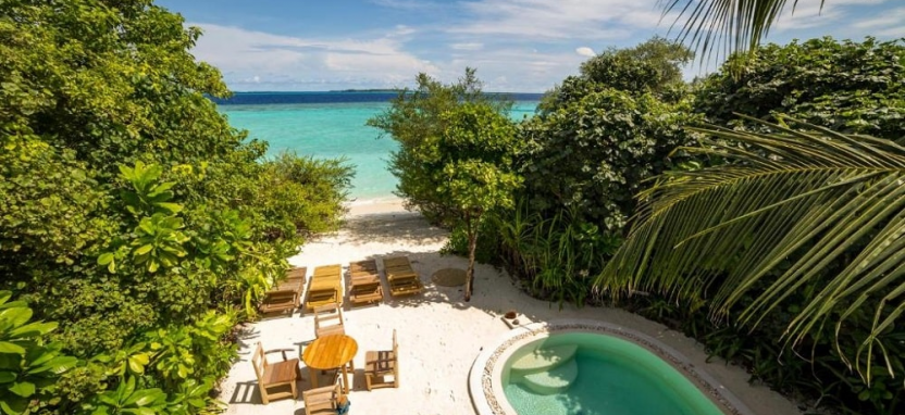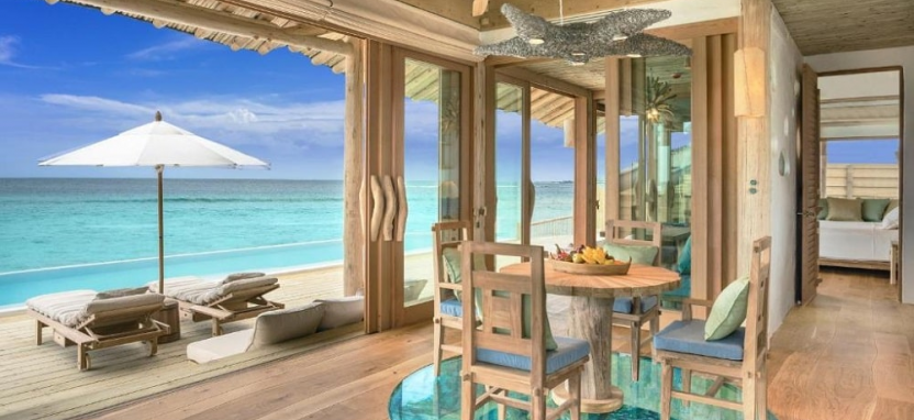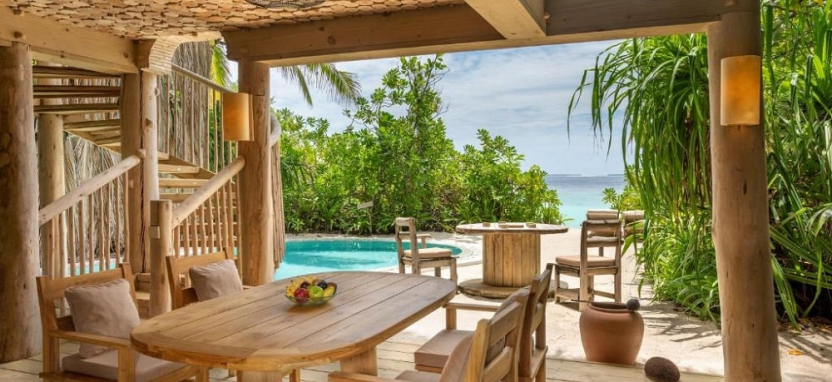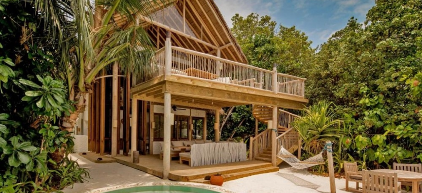 2-Bedroom Soneva Fushi Villa with Pool (395 кв. м) – двухуровневая пляжная вилла с двумя спальнями, в каждой кровать king-size, кушетка. Гостиные и комнаты отдыха на каждом этаже, 2 ванные комнаты, тропический душ на свежем воздухе, парная, терраса с бассейном, шезлонгами, гамаком, выходом к пляжу и видом на океан. Размещение – 4 взрослых с 2 детьми.