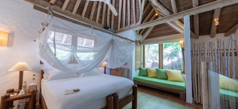 2-Bedroom Soneva Fushi Villa Suite with Pool (285 кв. м) – двухуровневый пляжный люкс с двумя спальнями, в каждой кровать king-size, кушетка. Гостиные и комнаты отдыха на каждом этаже, 2 ванные комнаты, тропический душ на свежем воздухе, парная, терраса с бассейном, шезлонгами, гамаком, выходом к пляжу и видом на океан. Размещение – 4 взрослых с 2 детьми.