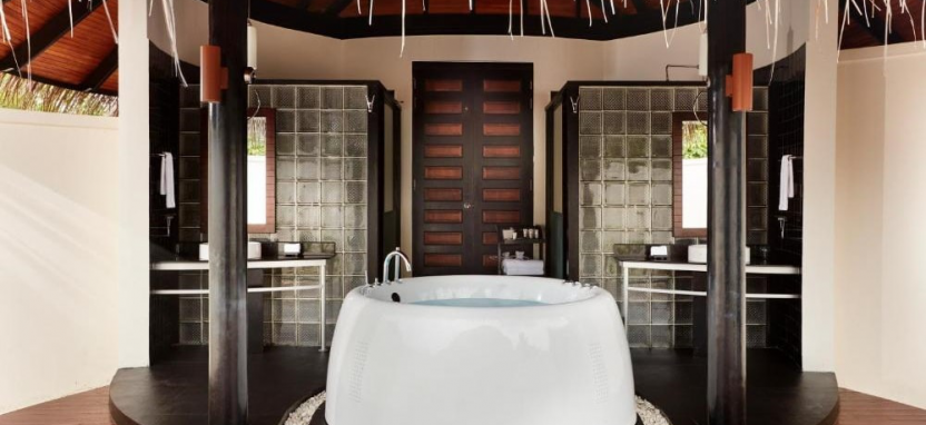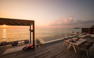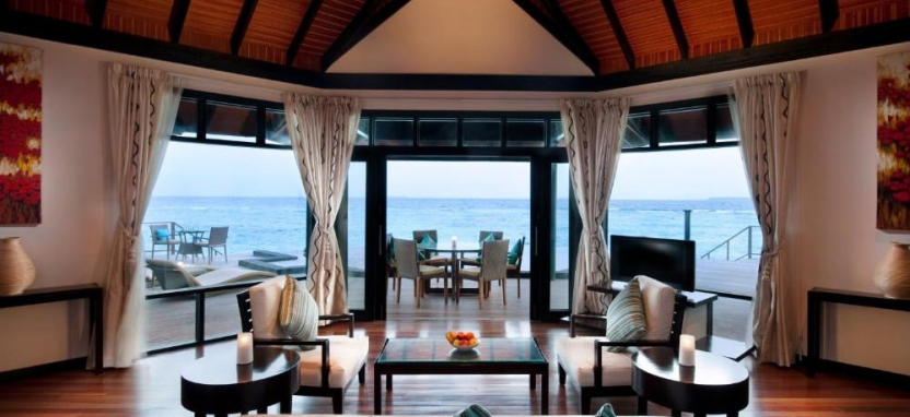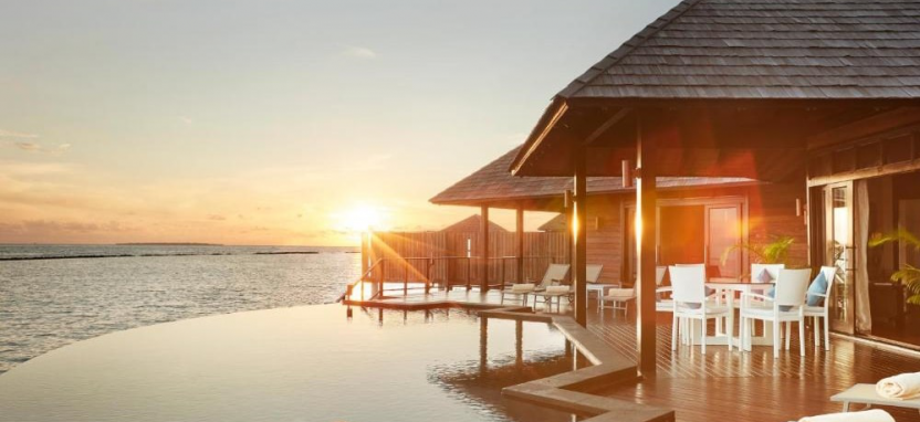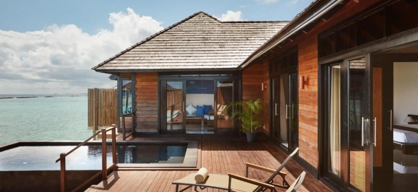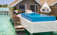 Infinity Water Villa (155 кв. м) – водная вилла. Спальня с кроватью king-size, стеклянные вставки, встроенные в пол, отдельная гостиная, ванная комната с гидромассажной ванной и душем, меблированная терраса с пейзажным бассейном, обеденной зоной, спуском в воду и видом на океан. Размещение – 4 взрослых с ребенком или 2 взрослых с 3 детьми.