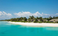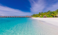 Пляж с белоснежным песком и коралловым рифом.