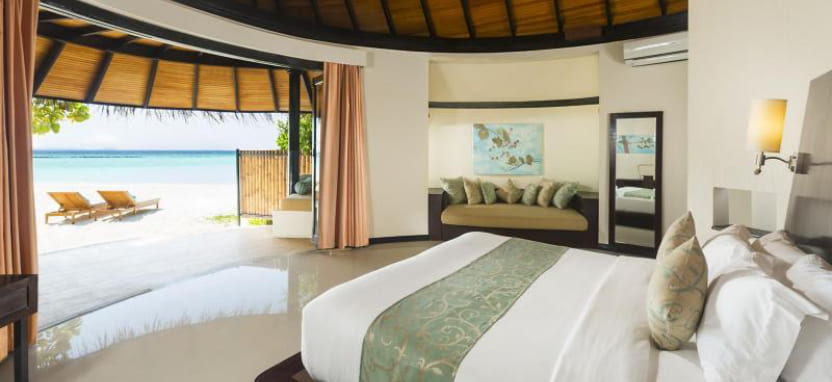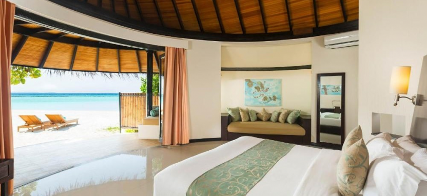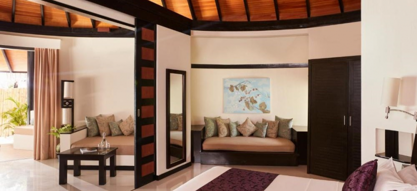 Deluxe Beach Villa (125 кв. м) – пляжная вилла в саду. Кровать king-size, зона отдыха, ванная комната с гидромассажной ванной и душем на отрытом воздухе, меблированная терраса с обеденной зоной, выходом к пляжу и видом на океан. Размещение – 3 взрослых с ребенком или 2 взрослых с 2 детьми.