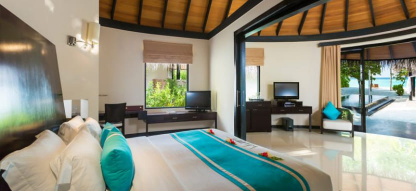 Horizon Water Villa (90 кв. м) – водная вилла. Кровать king-size, стеклянные вставки, встроенные в пол, зона отдыха, ванная комната с гидромассажной ванной и душем, меблированная терраса с джакузи, спуском в воду и видом на океан. Размещение – 3 взрослых с ребенком или 2 взрослых с 2 детьми.