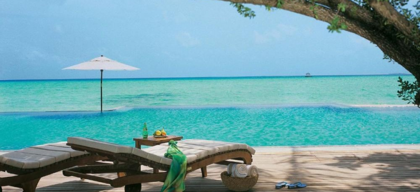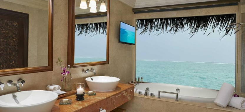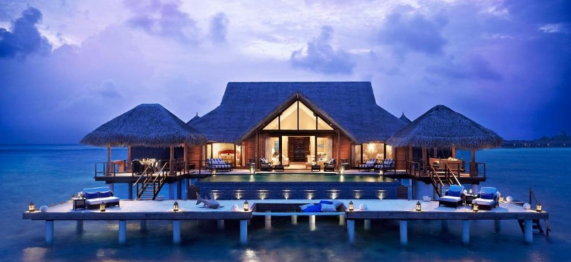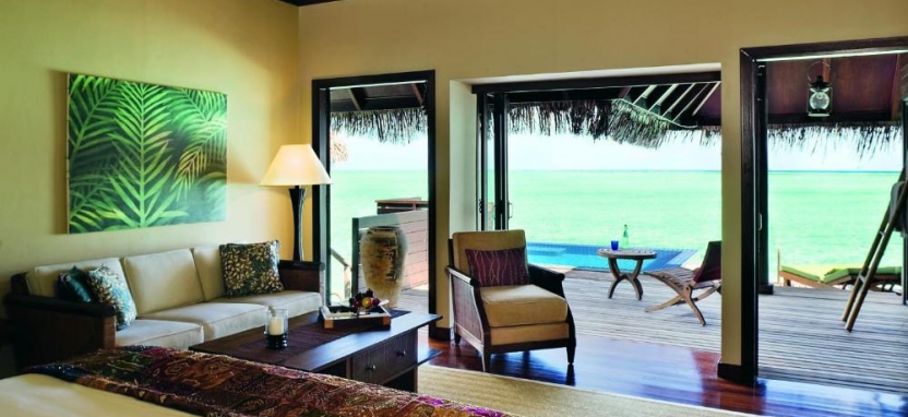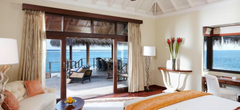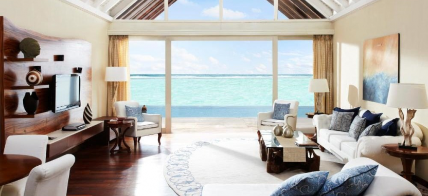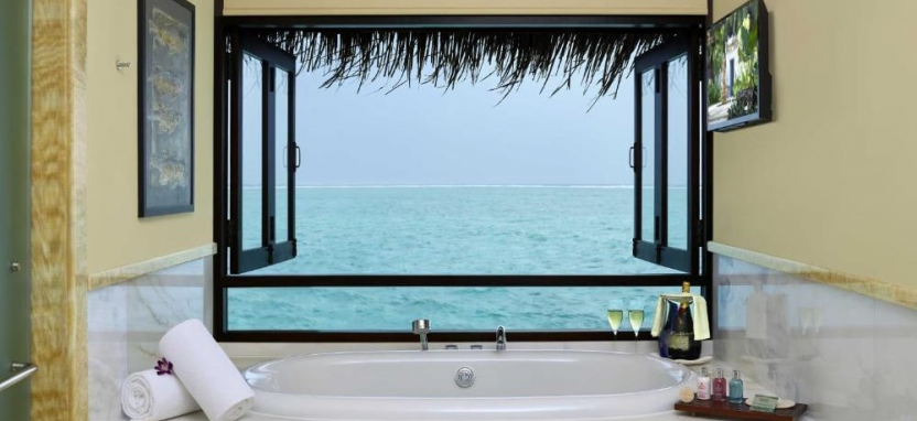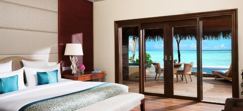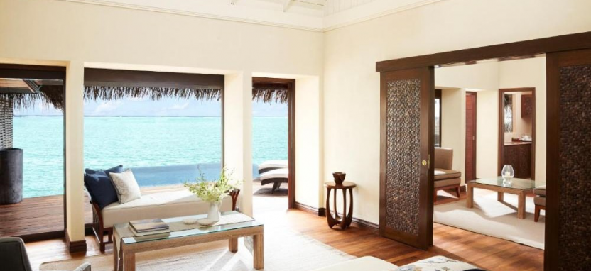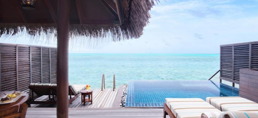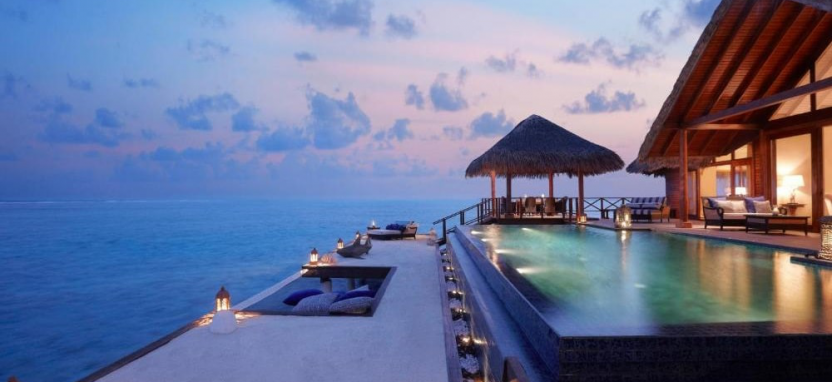 One-Bedroom Ocean Suite with Pool (195 кв. м) – просторная водная вилла. Спальня с кроватью king-size, гостиная, обеденная зона, ванная комната с ванной, тропический душ, меблированная терраса с соломенной крышей, большим бассейном, спуском в воду и видом на океан, зона релаксации на открытом воздухе с белоснежным песком. Размещение – до 4 человек.