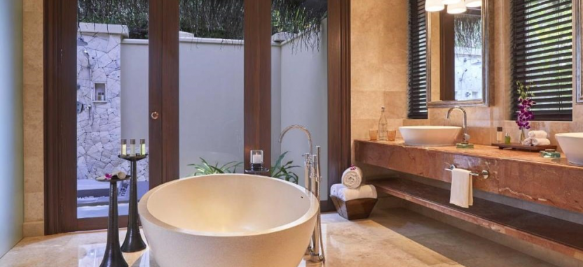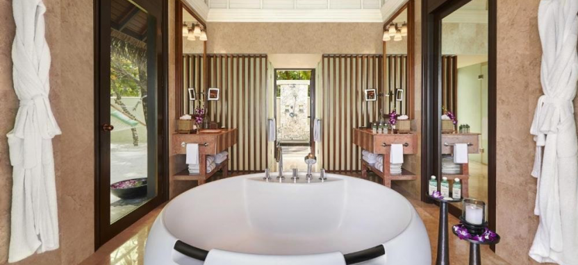 Two-Bedroom Beach Suite with Private Pool (365 кв. м) – двухуровневая пляжная вилла в саду. 2 спальни с кроватями king-size, балкон с панорамным видом на океан, гостиная, обеденная зона, 2 ванные комната с ванной, тропический душ на свежем воздухе, массажная зона, меблированная терраса с соломенной крышей, бассейном, зоной отдыха, выходом к пляжу и видом на океан. Размещение – до 6 человек.