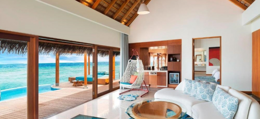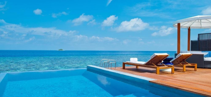Superior Overwater Villa (146 кв. м) – водная вилла. Кровать king-size, диван-кровать, зона отдыха, мраморная ванная комната с ванной и душем, меблированная терраса с бассейном, шезлонгами, зоной отдыха, спуском в воду и видом на океан. Размещение – до 3 человек.