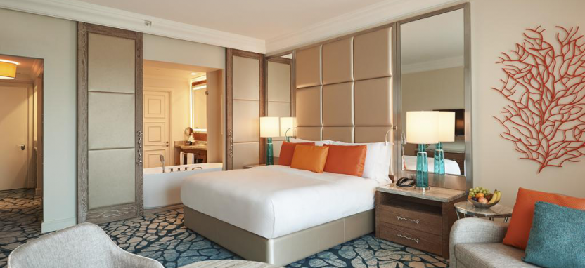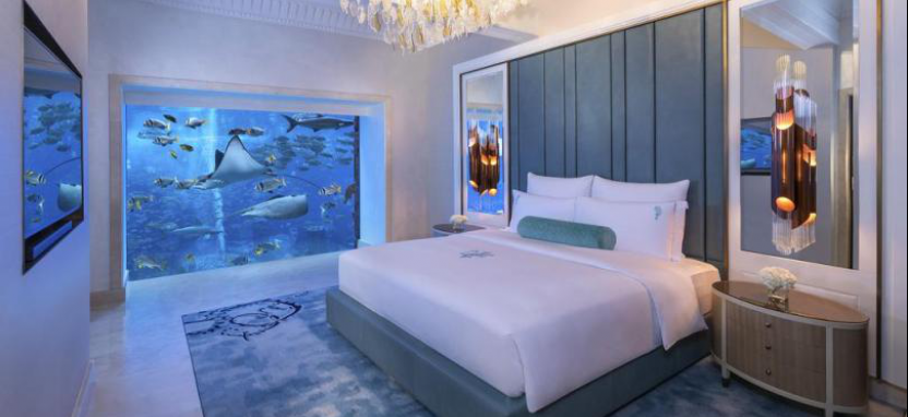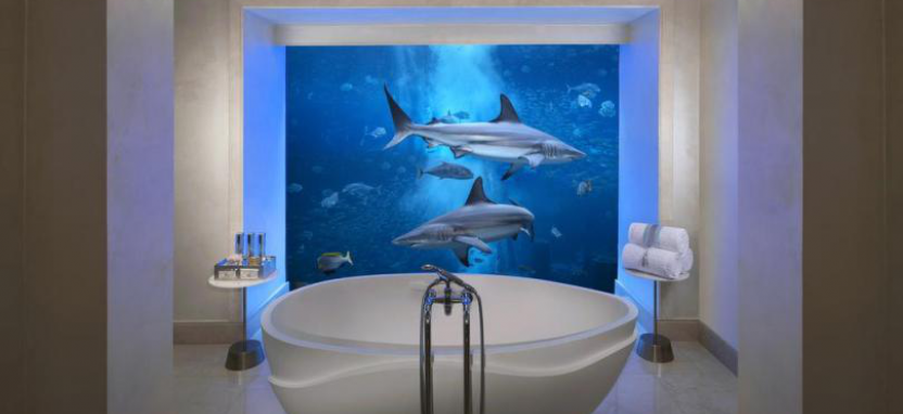 Underwater Signature Suite (165 кв. м.) - панорамный вид на невероятную подводную жизнь лагуны Ambassador, 1 спальня с кроватью King Size. Ванная комната с ванной. Прозрачные стены в мраморной ванной и в спальне открывают вид на грациозных акул, скатов, рыб и других обитателей лагуны Ambassador. Собственный лифт поднимет на этаж выше, в роскошную уединенную гостиную, окна которой расположены у поверхности лагуны Ambassador. Круглосуточное обслуживание персональным дворецким и регистрация в номере. Максимальное размещение - 2 взрослых или 2 взрослых + 1 взрослый (доплата за дополнительное спальное место) или 2 взрослых + 2 детей младше 14 лет (доплата за дополнительное спальное место).