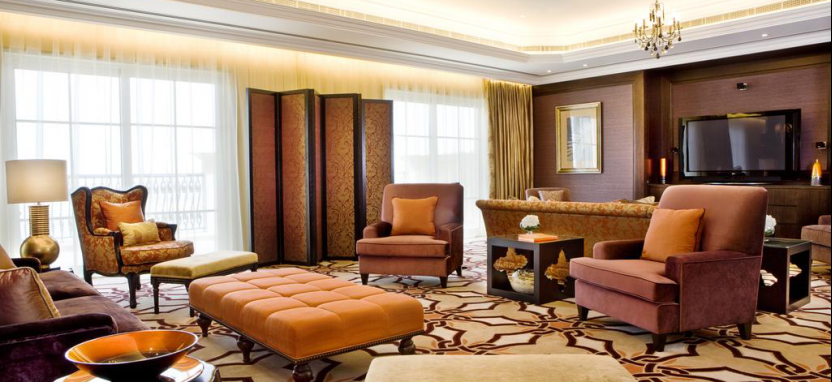 Grand Presidential Suite Sea View (391 кв. м + балкон + терраса) – роскошный люкс с панорамным видом на море, включающий отдельную гостиную, просторную столовую на 12 персон, 2 ванные комнаты и 2 зоны отдыха на балконе и террасе. Первая спальня с кроватью King Size, вторая с двумя односпальными (Twin). Гардеробная, рабочая зона с письменным столом. Ванные комнаты мраморные, с отдельными ванной и душем. Включает доступ в Club Lounge, а также выделенную зону на открытом воздухе. Предоставляется трансфер из и в аэропорты Дубая (до двух поездок за проживание, подтверждение за 48 часов до заезда). Максимальное размещение – 5 человек (с возможностью установки двух раскладных кроватей или двух детских кроваток).