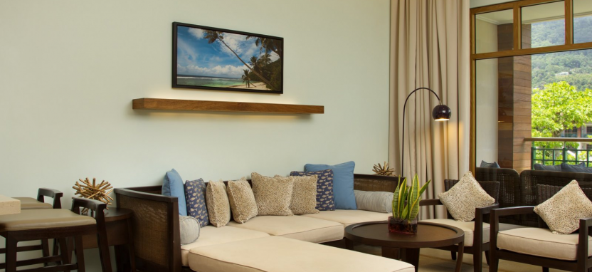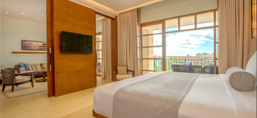 Junior Suite 3 pax (76 кв. м) - просторный люкс разделен на две части: гостиную с удобным диваном и настенным плазменным телевизором и спальню с кроватью размера «king-size». В ванной комнате есть большая ванна и тропический душ. Меблированный балкон с видом на сад отеля, бассейн или океан.