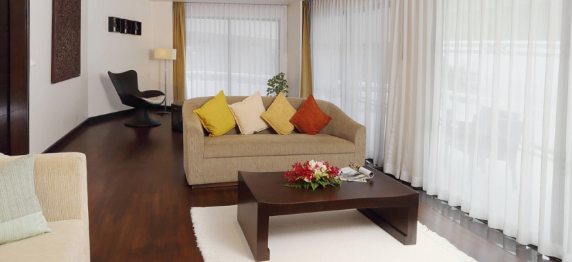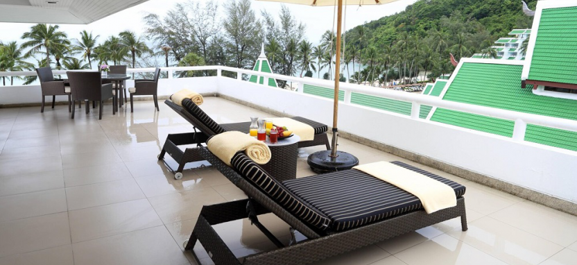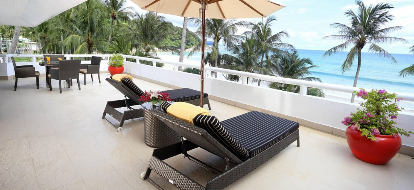 Deluxe Suite Oceanfront 3 pax (128 кв. м) - в номере спальня с большой двуспальной кроватью или двумя односпальными, гостиная с диван-кроватью, ванная комната, балкон площадью 63 кв. м с видом на море с красивым столом и стульями из тикового дерева и лежаками.