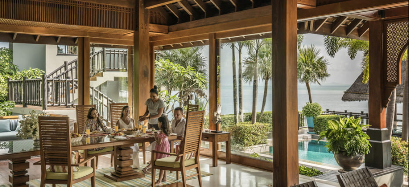 Three-Bedroom Residence Villa with Pool 7+4 pax (945 -1130 кв. м) - три спальни, две кровати king size, шесть односпальных кроватей, одна детская кровать, три ванных комнат с ванной, гостевой туалет, два тропических душа на открытом воздухе, терраса с обеденной зоной, два бассейна, собственный бар. Расположены на склоне холма с видом на залив.