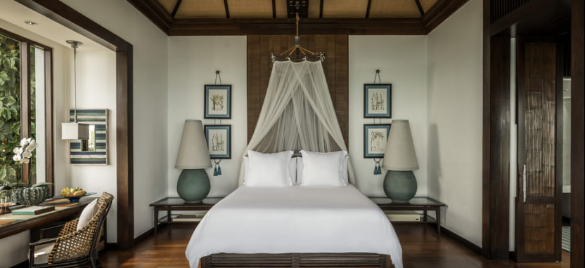 One-Bedroom Residence Villa with Pool 3 pax (660 кв. м) - одна спальня с кроватью king size, одна раскладная кровать, ванная комната с ванной, гостевой туалет, тропический душ на открытом воздухе, терраса с мебелью, бассейн, собственный бар. Расположены на склоне холма с видом на залив.