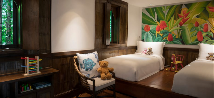 Family Pool Villa 4 pax (118 кв. м) - спальня с большой двуспальной кроватью, спальня с двумя односпальными кроватями, ванная комната с ванной, тропический душ на открытом воздухе, терраса с обеденной зоной, бассейн.