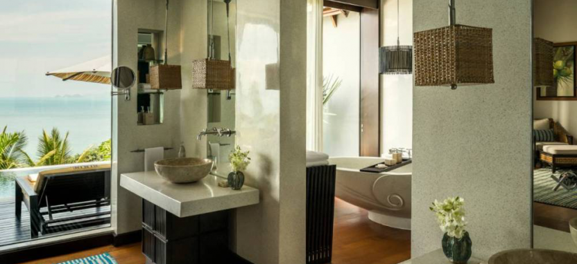 Panoramic Ocean-View Pool Villa 3 pax (103 кв. м) - спальня с большой двуспальной кроватью, дополнительная кровать, ванная комната с ванной, тропический душ на открытом воздухе, терраса с мебелью, бассейн. Виллы расположены на холме, вдали от пляжа с панорамным видом на залив.