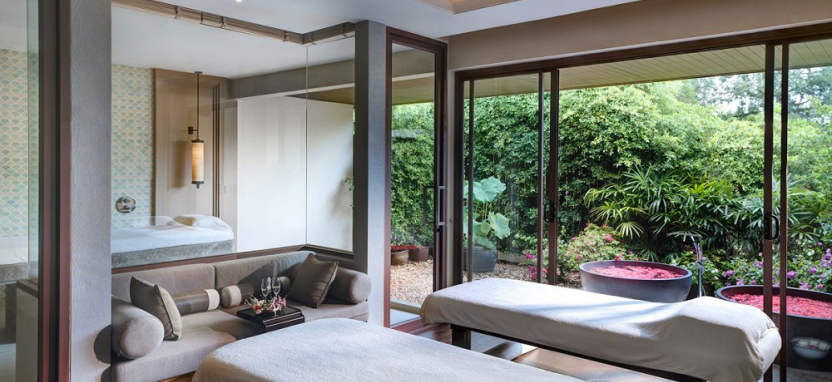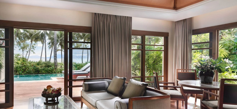 Two Bedroom Grand Deluxe Beachfront Villa with Private Pool 4+2 pax (195 кв. м) - вилла премиум-класса с двумя спальнями расположена прямо на берегу моря и сочетает в себе роскошь частного бассейна с удобством прямого выхода на пляж. Состоит из трех отдельных зданий - двух вилл с одной спальней, каждая с ванной комнатой и гостиной, а также бассейна в закрытом дворе.