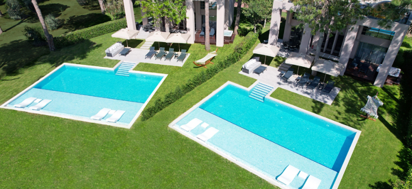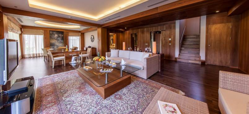 Presidential Villa 13 pax (1400 кв. м) - расположена в саду. Дуплекс. 6 спален на верхнем этаже (2 двуспальные кровати, 1 двуспальная кровать «кинг сайз» и 6 односпальных кроватей), 2 спальни для персонала на нижнем этаже комната для занятий спортом, хамам, сауна, спазона с джакузи и комната для процедур и массажа, бильярд и игровая комната, кинотеатр, гостиная, кухня, 9 туалетов, 6 ванных комнат (с джакузи и душем), частный открытый бассейн, гамак у бассейна, большой балкон с джакузи и терраса. Вид на сад, бассейн и гольф-поля.