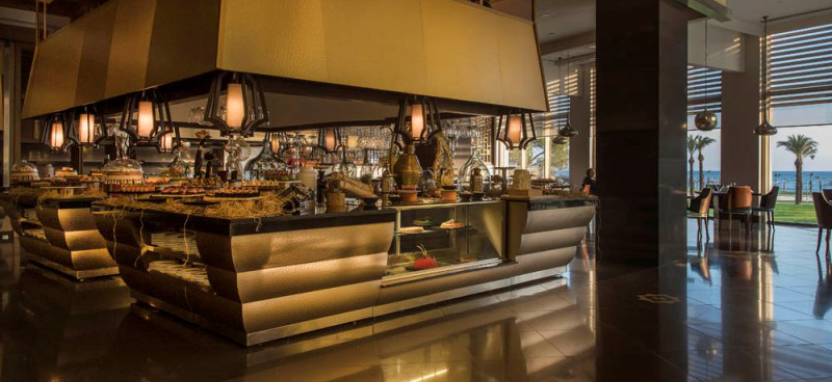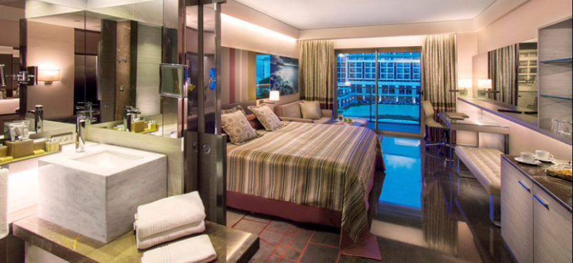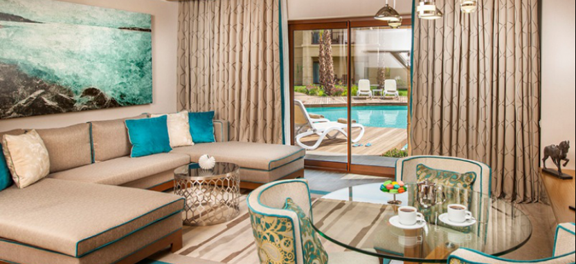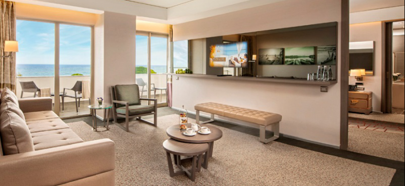 Royal Premium Suite (315 кв. м) - терраса, гостиная с обеденной зоной, мини-кухня, 2 спальни, хаммам, зона для занятий фитнесом, 2 ванные комнаты, гостевой туалет. Вид на море. Гости данного номера имеют особые привилегии.